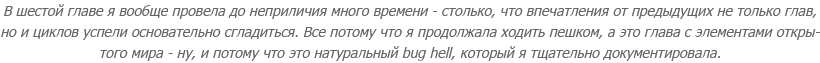 Влезла везде, где только смогла. В 3-ем цикле параллельно сделала почти две сотни интересных фотографических скриншотов и зафиксировала более полутора тысяч багов (в основном визуальных).