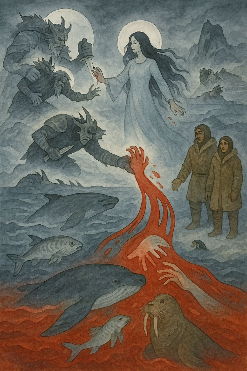 — Был дух по имени Санна, не похожий на прочих; уродливы были духи, а Санна была прекрасна; злобны и яростны были, а Санна кротка и спокойна; и хоть любого духа силой превосходила, сражаться она не желала, противна была ей жестокость. Отец ледяного неба разгневался, глядя на Санну. Сам на нее напал он, чтоб наказать за дерзость. Санна руки не подняла против него сначала, позволила Махаку злому себя избивать и мучить. Долго она терпела, но после одним движеньем наземь его швырнула, ногой наступила на горло. Сильно тогда испугался отец земли, где нет жизни, сказал — породил я Санну, верно, себе на погибель. Стал он молить о пощаде, клялся, что больше не станет свои принуждать творенья рвать и терзать друг друга. Поверила Махаку Санна, и руку ему протянула, чтобы помочь подняться. Он же ударил подло ее костяным кинжалом, пальцы руки отсек ей, и кровь пролилась на землю. Лилась и лилась кровь Санны, и стала безбрежным морем, и сама она в море скрылась, от Махака злого спасаясь. И пальцы, что в море упали, в рыб и китов превратились, и были они живыми, в них было дыханье Санны; другие моржами стали, тюленями стали иные, и были они живыми, в них было дыханье Санны; и были те, что упали на ледяную землю, на самый берег моря, и там людьми обернулись; и были они живыми, в них было дыханье Санны.