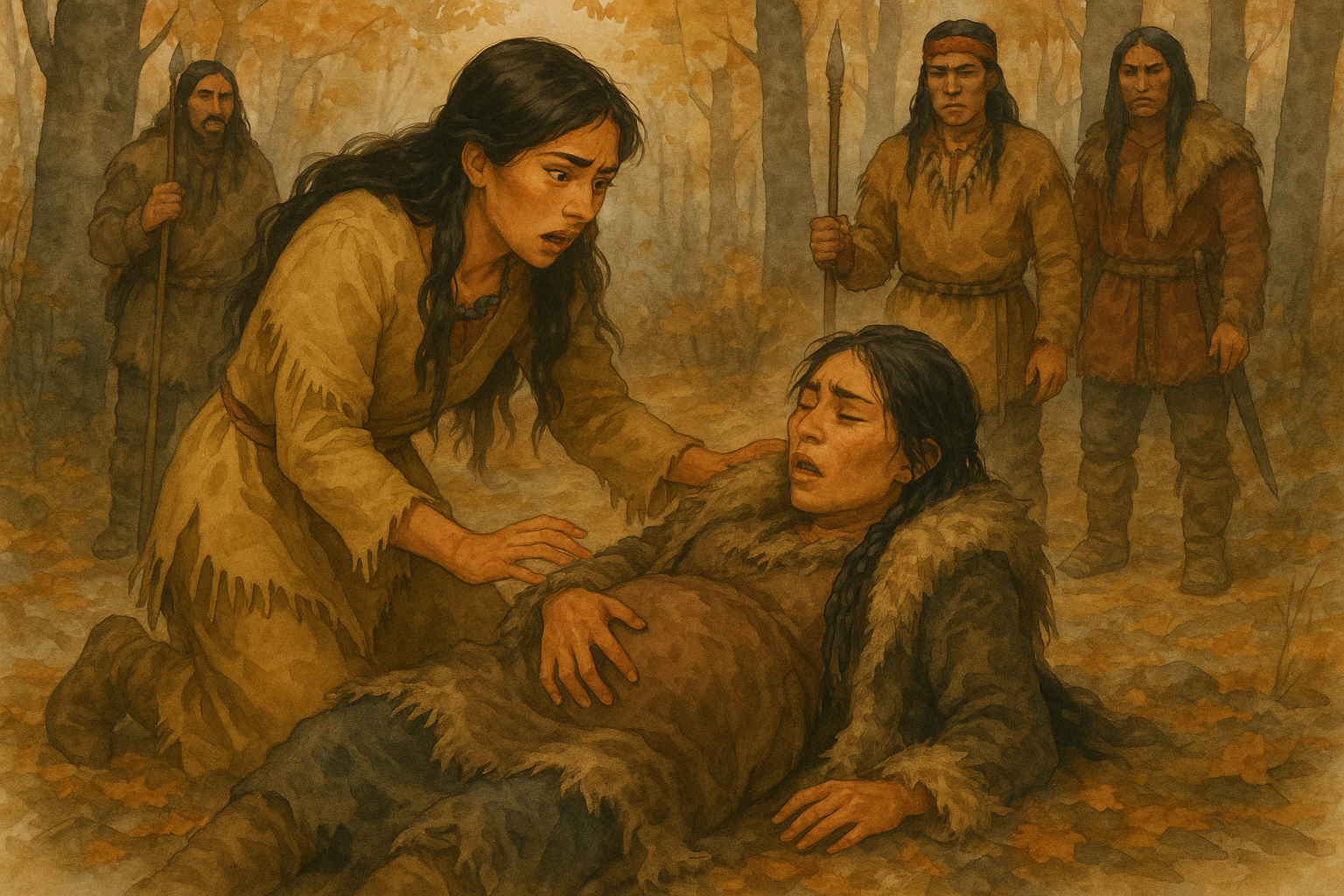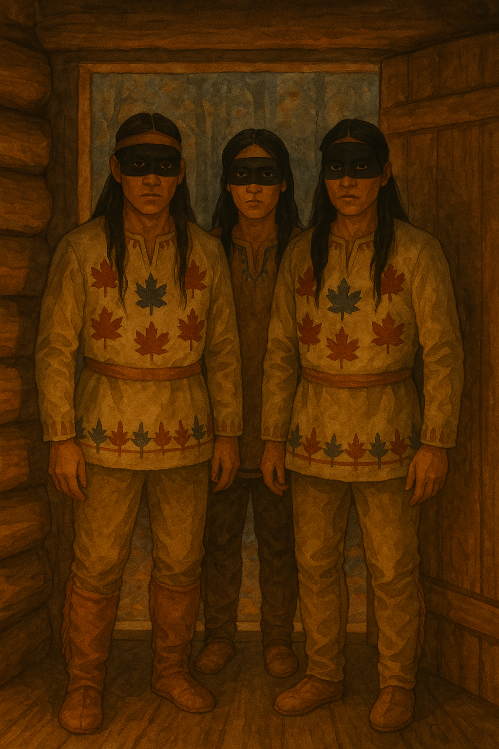 Кэтэри недоуменно взглянула на нее, потом перевела взгляд на гостей. Все трое были одеты в мокасины, брюки и длинные рубахи, вышитые красными и синими кленовыми листьями, длинные волосы перехвачены полосками кожи, лица ото лба до носа выкрашены черным.