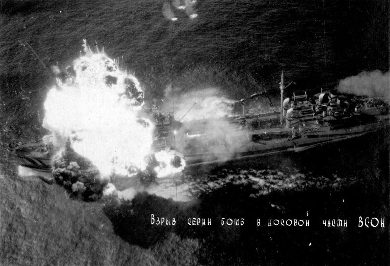 Автор: Андрей УлановФотографий работы топмачтовиков много, но это фото, на мой взгляд, одно из самых эффектных. 8 апреля 1945 года, Ил-2 атакуют немецкое вспомогательное судно снабжения «Франкен» (Trossschiff «Franken»). Белые всплески в верхней части снимка – места рикошета бомб ФАБ-100 от воды при топмачтовом бомбометании. Попали в корабль все четыре или нет, точно неизвестно, но «Франкену» хватило -- судно разломилось на две части и затонуло.