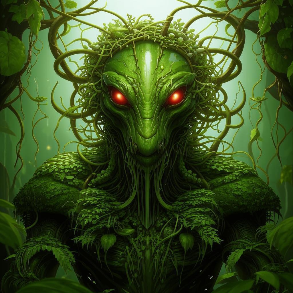 Ростом около двух метров, покрытое какой-то удивительной смесью хитина и листвы. Руки и ноги пришельца состояли из тысяч тонких стеблей, похожих на лианы, все четыре пальца на каждой конечности заканчивались трубками из которых тоненькими струйками сочился зелёный газ.