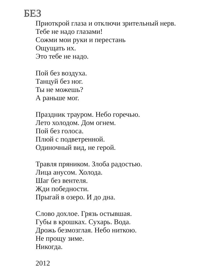 Если порыться в более ранних стихотворениях (например, стихотворение «Без», написанное в 16 лет), то там тоже есть интересные мысли, эпитеты и метафоры. Но они очень сложные для понимания. Я хотела выписать взрывающиеся эмоции, всё и сразу