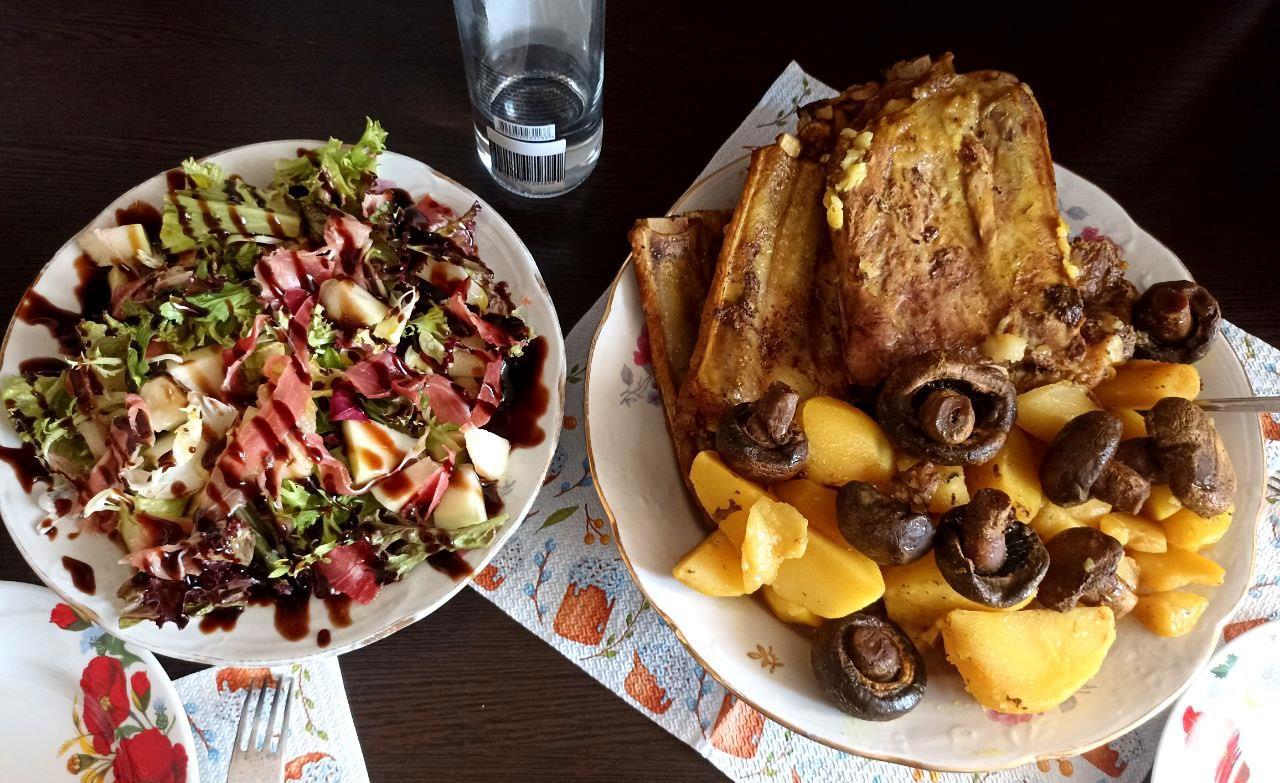 Воскресный обед: салат и рёбра, запечённые с грибами, картофелем, куркумой и чесноком. Это, граждане, самый вкусный новый салат за всё лето. Я постоянно то и это мастерю, иногда получается вкусное, иногда — ерунда. Этот буду делать, пока не наемся.