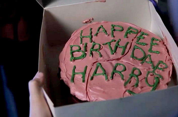 Кадр из фильма — торт, на котором Хагрид с любовью (ну и что, что с ошибками) написал «Happee Birthdae Harry»