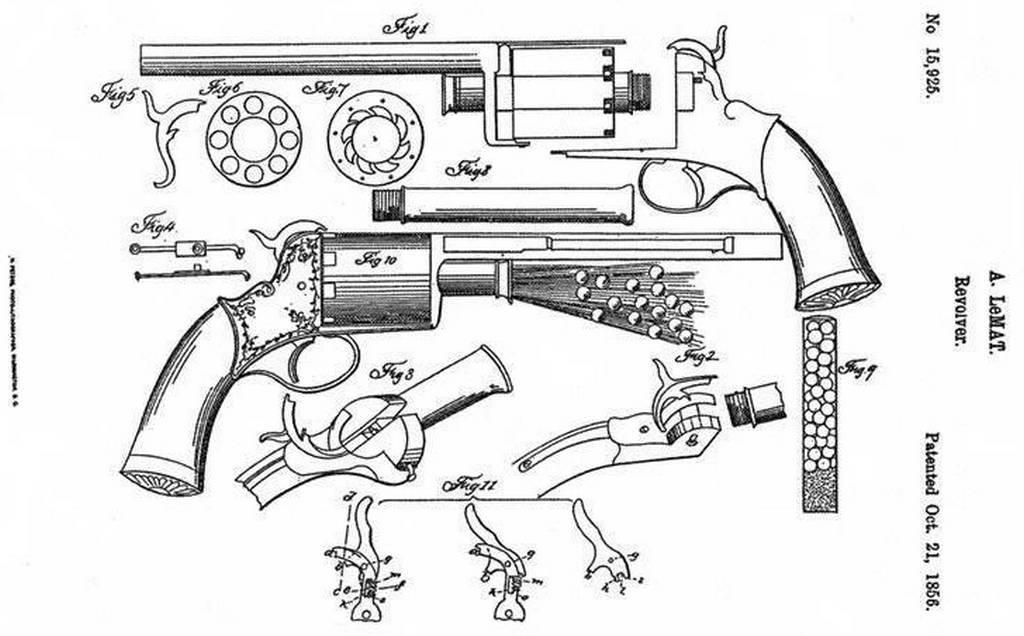 Не только Лефош сообразил делать количество патронов в барабане побольше. Многие понимали преимущества огневой мощи в самых разных ситуациях. Но один из мастеров оружейников пошёл в этом вопросе дальше других. Жан Александр Франсуа Ле Ма (Jean Alexandre François Le Mat) родился в 1821 году во Франции. Патент на свой вариант револьвера он получил в 1859 году. Вот чертёж из этого патента: