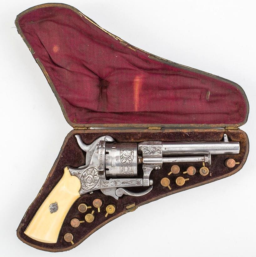 Согласитесь – для главного героя, обладающего особыми боевыми навыками, такой образец вполне может пригодиться. Конечно же выпускали револьверы Лефош и в «подарочном» исполнении. Вот такой вариант от 1856 года: