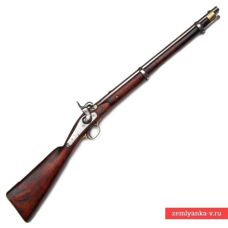 То есть механизм слегка изменился, но основное направление осталось. Это всё были минимизированные до предела по весу и размерам образцы. Стало даже проще. Вместо спускового крючка – маленькая «кнопка», вместо растопыренного курка что-то едва выступающее или вообще колечко. Всё для того, чтобы за одежду не цеплялось. Стреляет не так метко и не так далеко, как здоровенные пехотные ружья? Да и ладно – можно и поближе подъехать, а там и до главного боя недалеко. То есть до рубки. Ведь ружьё-то оно так, – вспомогательное оружие. Заряжать его слишком долго. И пистолет тоже долго. Хотя с ними проще – их можно и пару взять. Но ведь дорого это. А казак всё сам покупает. Другое дело в армии. Там рядовым бойцам из казны отпущено деньжат, и даже куплен начиная с 1849 года вот такой карабин: