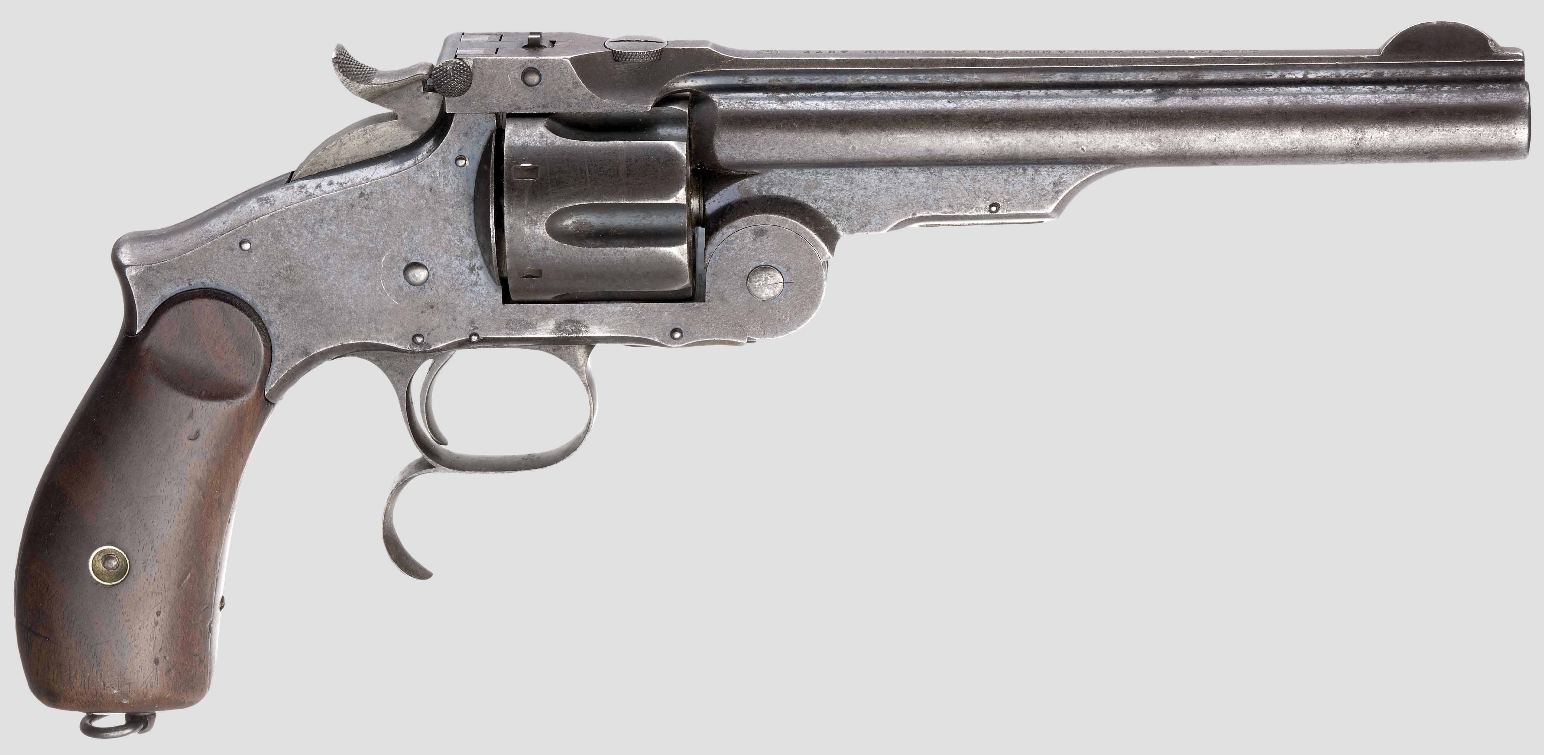 Я уже как-то уделял внимание этому эпизоду из битвы оружейников, поэтому просто напомню немного. Работавшие у Кольта оружейники предложили боссу сделать унитарные патроны и пистолет под них. Босс, не подумавши их послал подальше с их идеей. А они взяли, да и ушли со своим патентом. В результате через короткое время, в 1860 году Америка и весь мир узнали о пистолетах 44 American First Model от американской фирмы «Смит и Вессон» (Smith and Wesson). На родине его назвали лучшим образцом оружия самообороны. Но это нам по барабану, как говориться. Значительно важнее было то, что в 1871 году русская Оружейная комиссия признала револьвер годным для русской армии. Было закуплено сразу 20 тысяч штук, которые и попали к нашим воинам под названием «4,2-линейный револьвер Смит-Вессон 1-го образца». После модернизации по требованиям Заказчика револьверы фирмой были доработаны. Эту модель там назвали «№ 3 Russian First Model». Потом его ещё пару раз переделывали. Всего фирма «Смит-Вессон» сделала для России 131 тысячу своих пистолетов. Ещё сто тысяч сделали для нас немцы (Ludwig Loewe und K°). Двести тысяч револьверов «Смит-Вессон» было сделано в Туле. Вообще с учётом разницы в некоторых деталях выглядели эти пистолеты вот так: