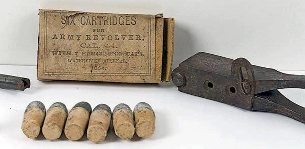 Потом было банкротство Кольта и новое начало с новой моделью. Это был Кольт Уолкер (Colt Walker 1846 г.). К нему предлагалось устройство для изготовления патронов. Вот это устройство вместе с патронами: