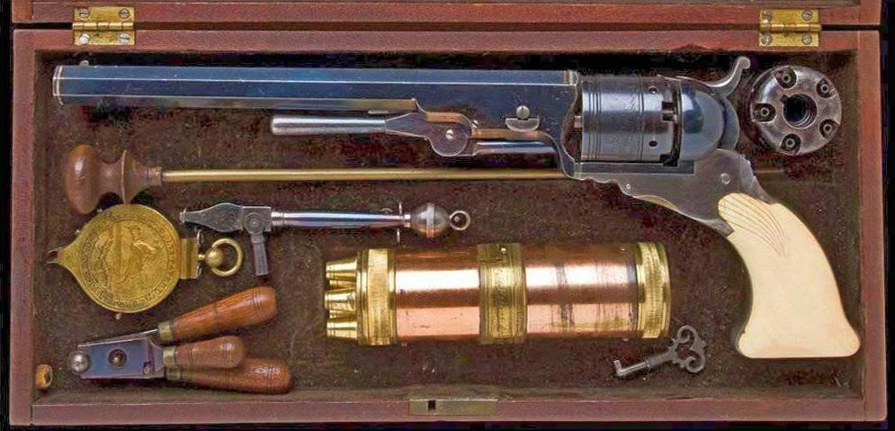 Неплохо в общем, хотя проблемы не решало. Все прекрасно знали, где решение, но не спешили. Решение было в револьверах. Они были особенно интересны как минимум для двух родов войск. Это для кавалерии всех мастей и для моряков. Им револьверы были очень нужны для абордажных боёв. Но стоили они очень дорого, да и заряжать их было всё равно долго. Приезжал Самюэль Кольт к Императору. Подарил ему набор своих револьверов. Вот один из них: