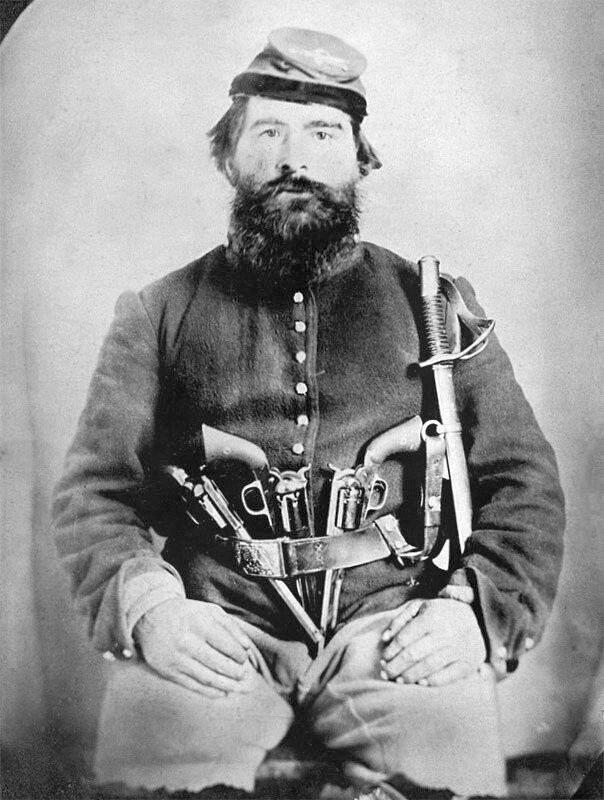 Представьте себе, что сначала вы насыпаете в каждый стаканчик барабана порох, потом туда же укладываете пыж, потом всё это старательно уплотняете шомполом. Шомпол с рычажком у этих револьверов находится под стволом, кстати. Потом, наконец, вы в этот стаканчик укладываете пулю и снова пыж. И опять всё уплотняете шомполом. Процесс повторяете от пяти до семи раз и более в зависимости от количества зарядных камор в барабане. Когда закончили с зарядами, вам ещё нужно перевернуть револьвер и аккуратно установить на брандтрубки капсюли. А теперь представьте себе, что всё это нужно проделать сидя в седле во время пыльной бури, или дождя, или снегопада, или… много неприятностей может быть. Ясно, что зарядить пистолет можно было только перед боем. Потом будет некогда. Поэтому стрелки стали носить по два револьвера и даже больше (если финансы позволяли). Вот эндак это выглядело: