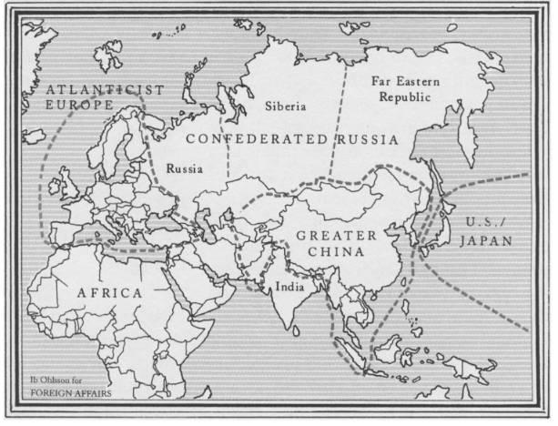 Ядром нового трансконтинентального механизма могла бы стать постоянная комиссия из ведущих евразийских держав — США, Европы, Китая, Японии, федеративной России и Индии — совместно решающая критически важные вопросы стабильности Евразии. Появление такой трансконтинентальной системы постепенно снимет с Америки часть её бремени, одновременно сохраняя её решающую роль как арбитра Евразии более чем на одно поколение.