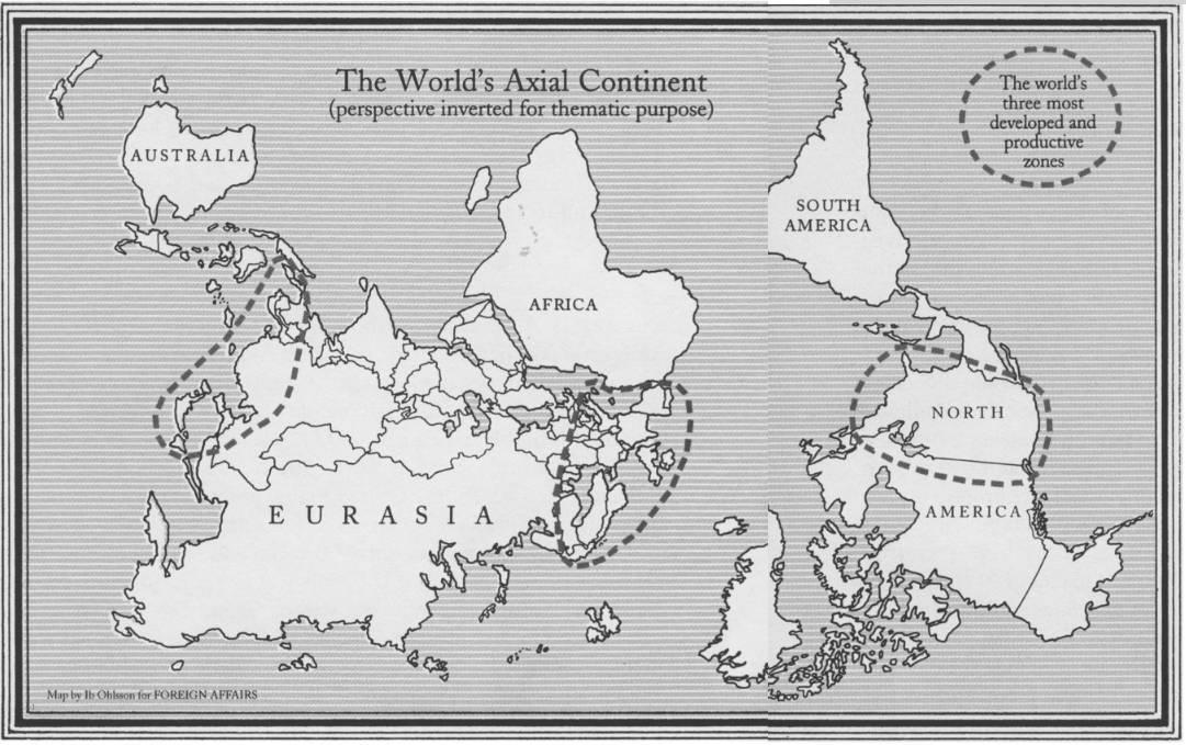 Евразия — главный суперконтинент мира. Власть, доминирующая в Евразии, смогла бы оказывать решающее влияние на два из трёх самых экономически продуктивных регионов мира — Западную Европу и Восточную Азию. Взгляд на карту также показывает, что страна, доминирующая в Евразии, практически автоматически контролировала бы Ближний Восток и Африку.