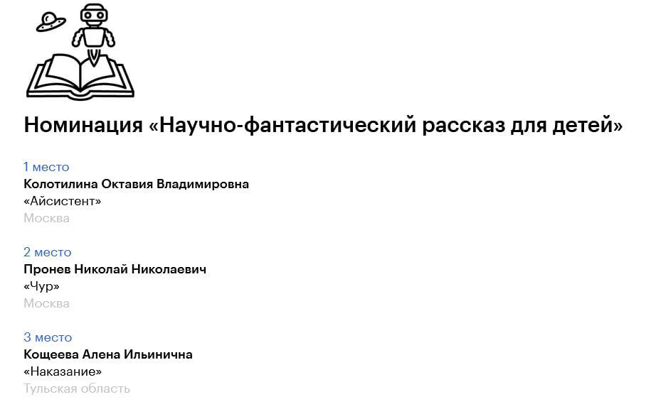 https://asi.ru/russia2050/. Рассказ «Айсистент» на первом месте в детской фантастике!