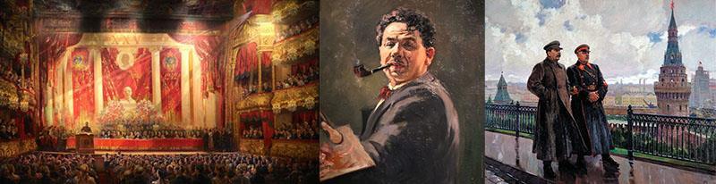 *На картине "Гимн Октябрю", изображено "Торжественное заседание трудящихся Москвы по случаю 25-й годовщины Октябрьской революции 6 ноября 1942 года", которого на самом деле не было в природе, вожди тогда отмечали праздник в узком кругу.