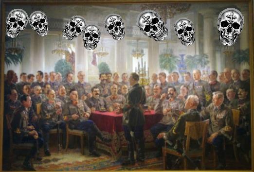 Полотно это было, так сказать многофигурное. На нем были изображены легендарные командиры Первой Конной: комкоры, комдивы, комиссары, маршалы Буденный с Ворошиловым и естественно Почетный красноармеец Первой Конной товарищ Сталин. Всего 48 ярких персоналий и почти все с шашками. Отбор их конечно был строгим, сам маршал Ворошилов контролировал список и согласовывал его со Сталиным.