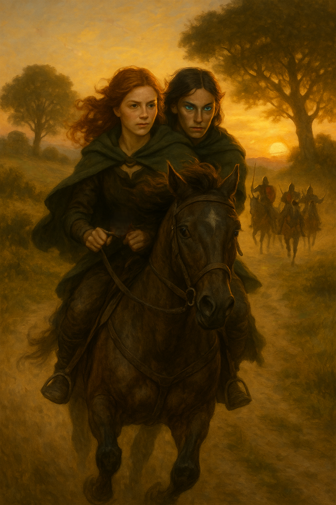 Вдалеке позади послышался топот копыт. Воин с его звериным чутким слухом распознал его и точно знал — солдаты королевства Саритании преследовали беглецов, он уже уловил звон доспехов и яростные крики. Вооруженные всадники показались на далёком холме, поднимая пыльное облако. Девушка прижалась к сидевшему позади спутнику, её сердце билось учащённо.