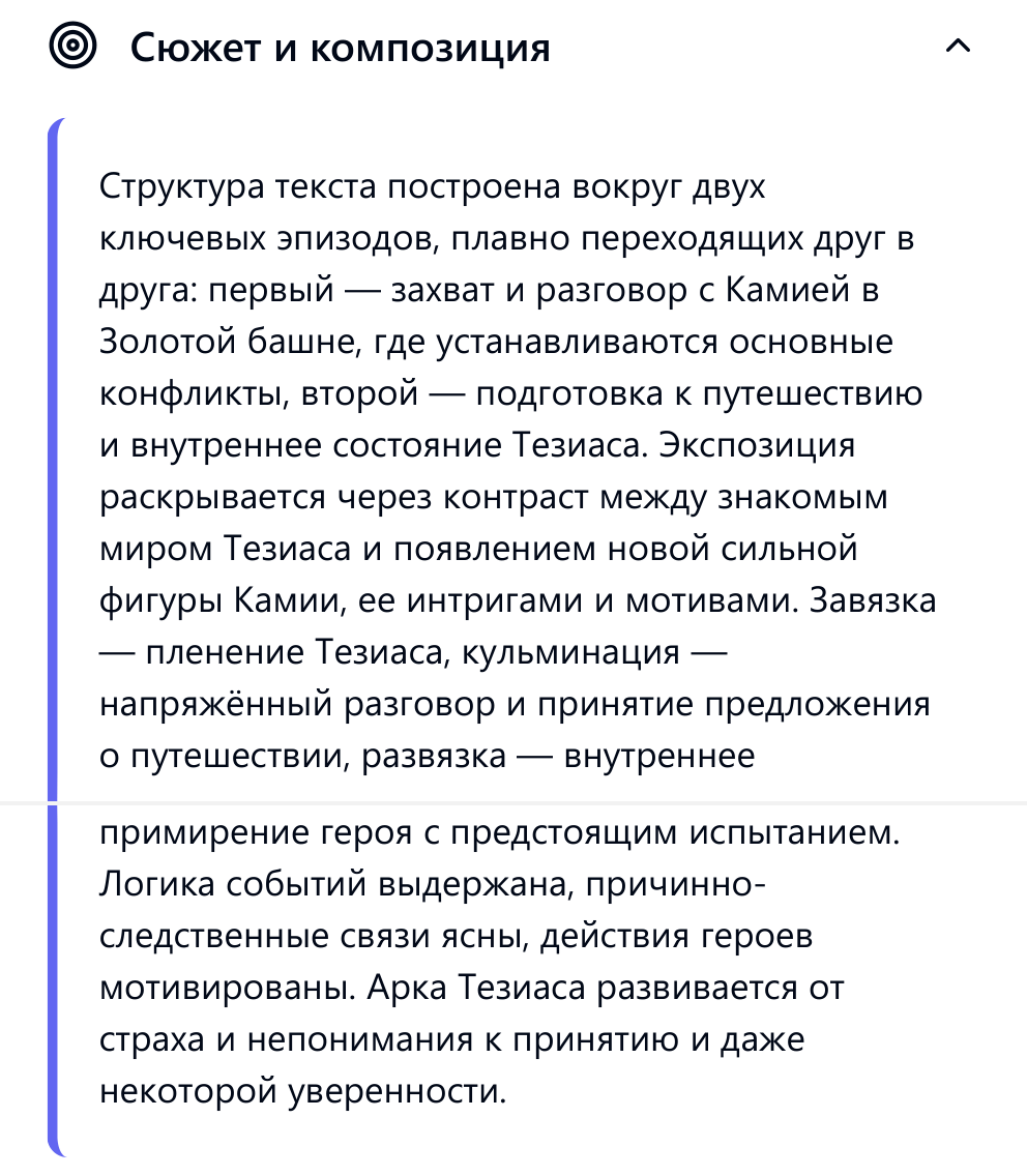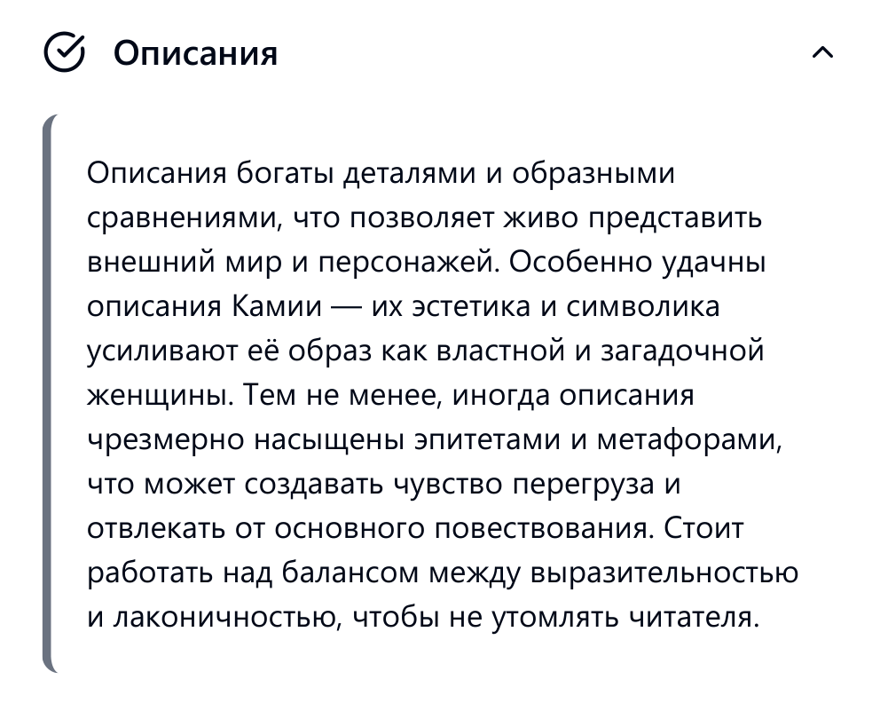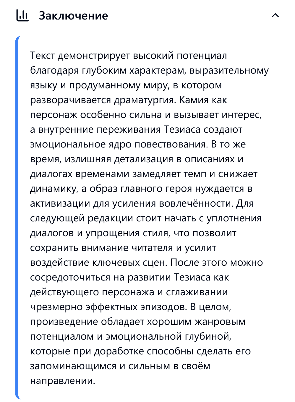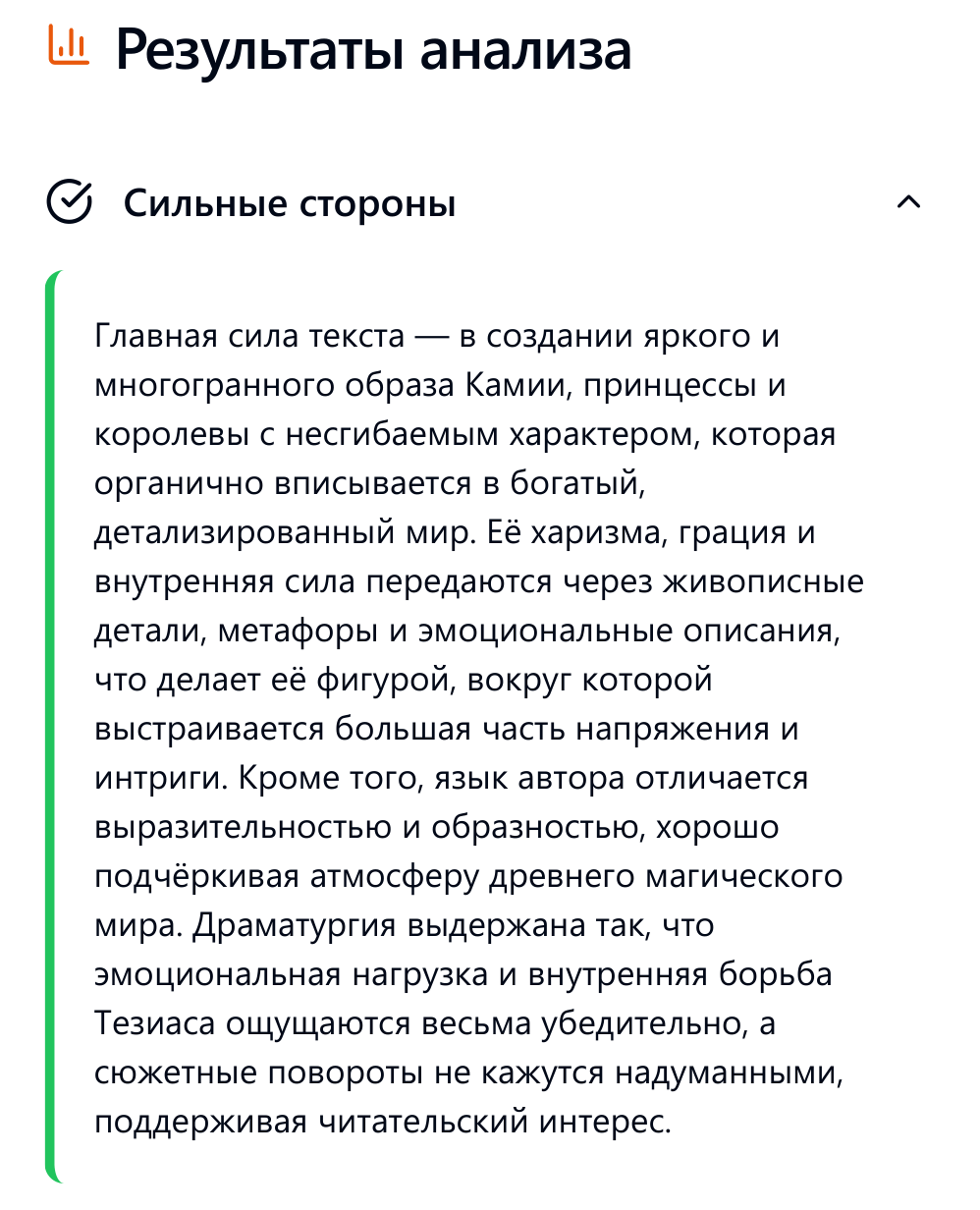 Особенно хорош LitCritic AI в анализе коротких текстов. Разбор больших, наоборот, плывёт и провисает, и скорее бесполезен; думаю, владельцам сервиса не стоит гнаться за быстротой анализа, а больше внимания уделить качеству. Задел для этого есть.