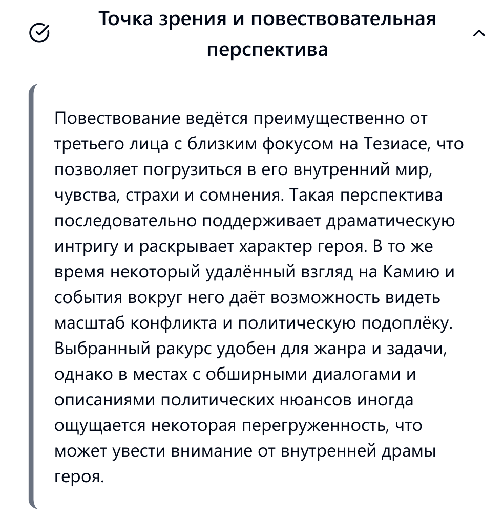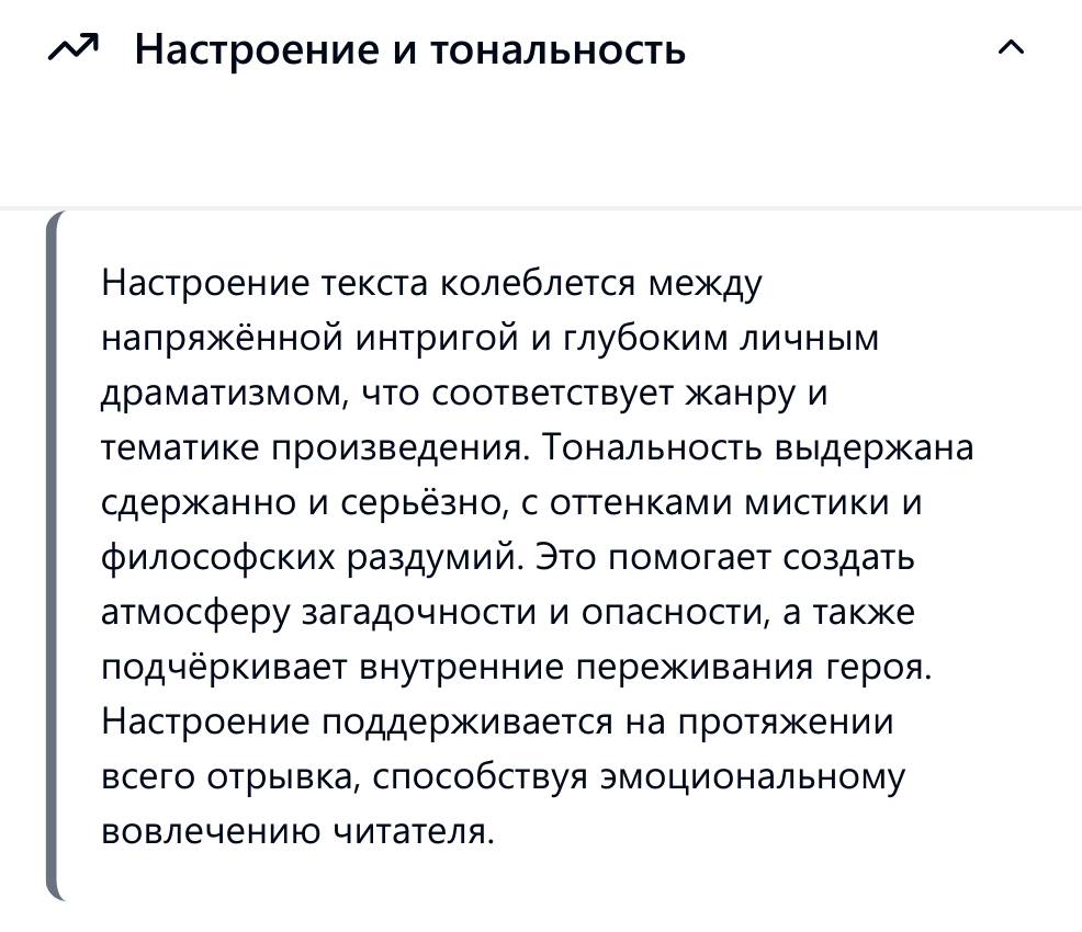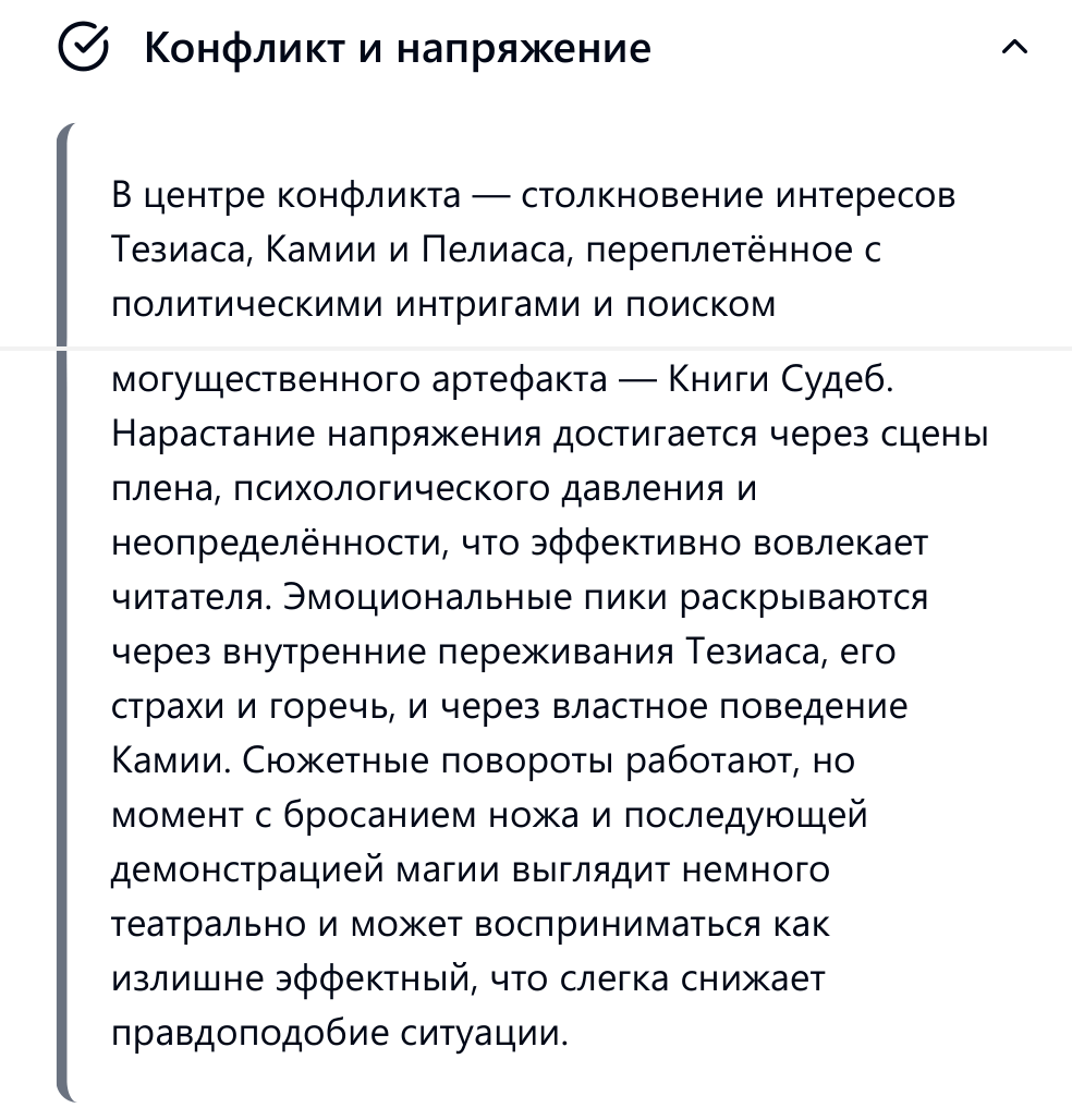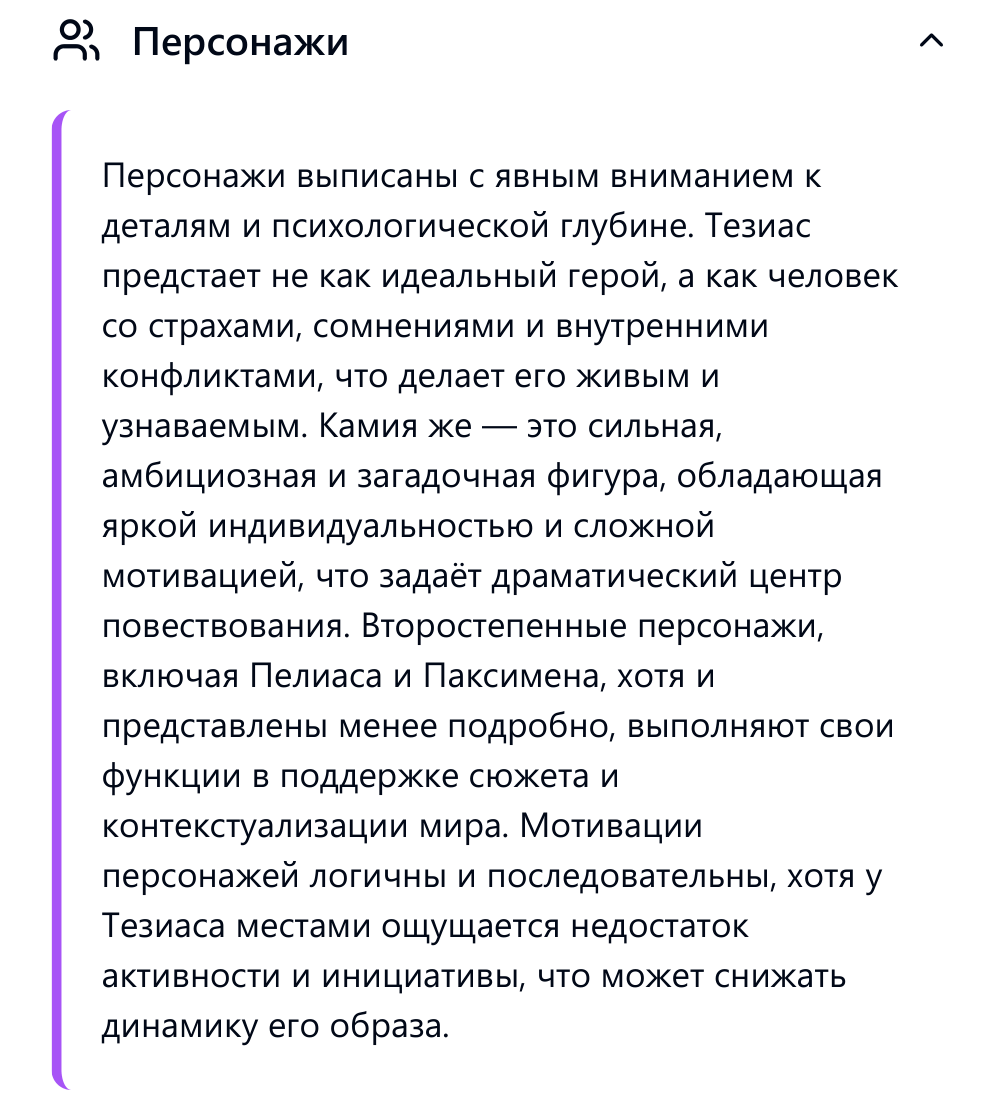 Особенно хорош LitCritic AI в анализе коротких текстов. Разбор больших, наоборот, плывёт и провисает, и скорее бесполезен; думаю, владельцам сервиса не стоит гнаться за быстротой анализа, а больше внимания уделить качеству. Задел для этого есть.