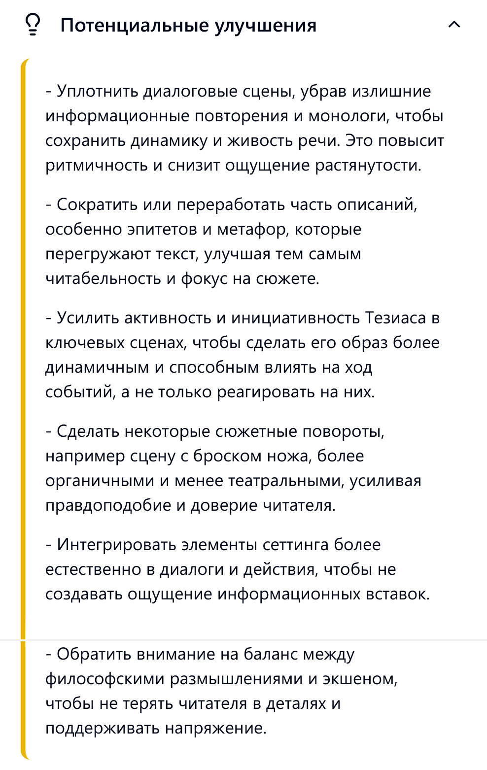 Развитие любовной линии (если планируется): Хотя в повести присутствует напряжение между Тезиасом и Камией, оно не перерастает в полноценную любовную линию. Развитие этого аспекта могло бы добавить тексту глубины и эмоциональности.