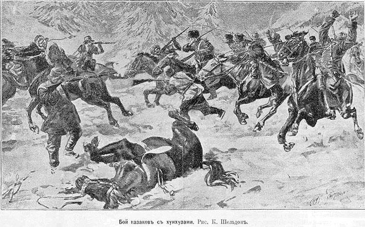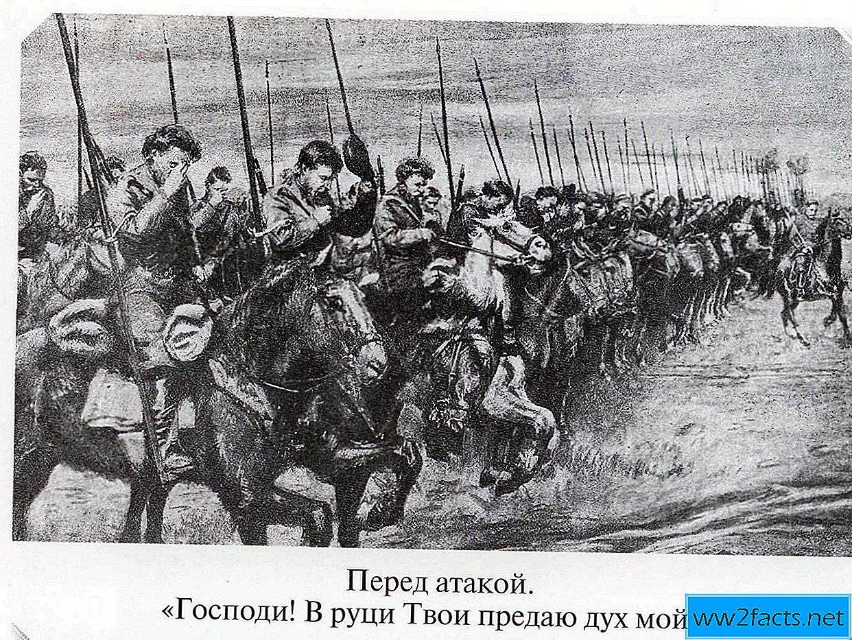 "Наступал момент, о котором каждый из нас мечтал с раннего возраста - атака в конном строю и рубка противника. Подтянув подпругу у моего горячего и не совсем послушного коня и проверив, легко ли шашка выскакивает из ножон, я огляделся. Взвод был готов. По совету бывавших уже в конных атаках офицеров мы оставили наши "кожухи" и бурки под скирдою и в строй стали налегке. Опять команда: "По коням; садись", - и взвод выравнялся по соседям юнкерам. Правее нас выстраивался 1-й эскадрон; левее виднелись густые ряды Елизаветинцев и Марьинцев. Передние сотни сразу же построили двух-шереножный развернутый фронт; кто был во второй линии, не знаю, но кто-то был. До неприятеля в этот момент было шагов с тысячу. Командир сотни, гвардеец полковник Рашпиль, выехал на уставную дистанцию вперед, повернулся в седле и, указывая в сторону противника, скомандовал: "Сотня в атаку - Шашки вон - рысью - МАРШ!" - и сразу же поднял своего большого гнедого коня в свободную рысь, сверкнули наши шашки, и сотня двинулась за своим командиром. Первое время мы шли по твердому грунту, и наши кони охотно и легко следовали за бывшими впереди взводным командирами. Мой "Азият" вообще не терпел кого-либо впереди, и мне трудно было сдерживать его порыв вперед. Злился я на него ужасно: негодуя на сдерживающий повод, он уклонялся то вправо, то влево, и ломал строй. На этого коня и двух рук было мало, а тут ведь в правой руке была шашка; как я не отрубил себе ухо, не знаю. Еще более негодовали на меня мои соседи, прапорщик Кадушкин слева и подъесаул Помазанов справа. Мы быстрою рысью сближались с неприятелем. Огонь противника был редким, но пули уже находили случайные жертвы в наших рядах. Прошли мы так, рысью, шагов 300 - 400; полковник Рашпиль перевел нас на намет, и только что мы начали скакать, как твердый грунт кончился, и мы очутились на вспаханном поле. Кто знает кубанский запаханный чернозем, да еще весной, после таяния снега и дождей, тот поймет наш ужас, когда мы начали чувствовать, как все больше и больше уменьшалась скорость нашего движения. Мы продолжали скакать, но уже на тяжело дышавших лошадях. С расстояния 400 шагов красные открыли огонь залпами. Здесь уже можно было видеть, как падали лошади и валились с них люди. А немного впереди, еще 100 - 150 шагов, сотня напоролась на болото. Лошади с трудом, где "собачьей рысью", а где и шагом, двигались вперед по этому болоту. Против нас красные были в двух шеренгах; передняя стреляла "с колена", а задняя стоя. Цепи красных были неровные: местами они сбивались в кучки, а в других местах стояли одиночки, в 3-х, 4-х шагах друг от друга. Каждый из нас смотрел вперед и ждал - когда же они повернут и побегут назад. Но ни беглецов, ни потерявших дух не было. Вглядываясь вперед я, к своему удивлению, увидел на некоторых рыжие и черные мохнатые шапки, каких много было у закубанских пластунов. Так вот почему не было паники у нашего врага! Мы продолжали атаку, хоть наше "Ура" уже перестало быть грозным и мощным. Нас продолжали расстреливать, теперь уже частым огнем. Тут, собственно, и погибла наша сотня. Пал Рашпиль, многие юнкера; получил рану в грудь и наш взводный, подъесаул Чигрин; рядом со мной был ранен в руку подъесаул Помазанов. Линия атакующих перестала быть линией: кто выбыл из строя по ранению, у кого упала лошадь, а кто и повод начал укорачивать, не видя рядом соседей. Наше