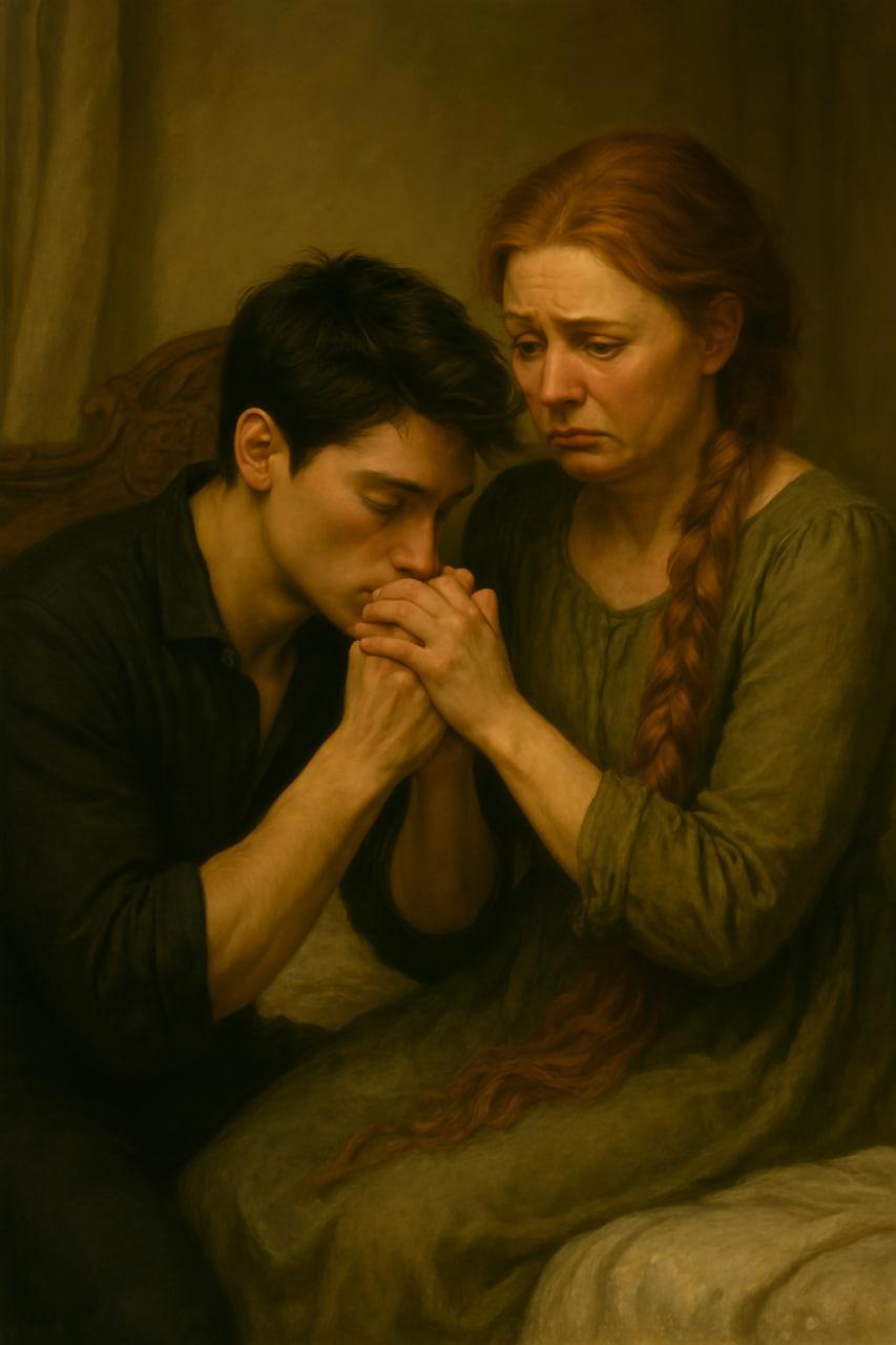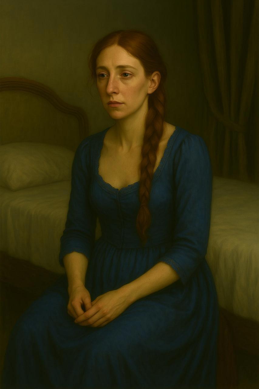 И вроде бы ИИ запомнил, как выглядит Элиза, но для сцены, где Эрик успокаивает мать, он создал совершенно другую версию героиню. Постаревшая, полненькая, с потухшими заплаканными глазами. Если женщина на первом портрете кажется грустной, но немного мечтательной, утонченной, то на втором веришь, что ей плохо, как морально, так и физически. Потому что такое состояние не может не сказываться на внешности, здоровье...