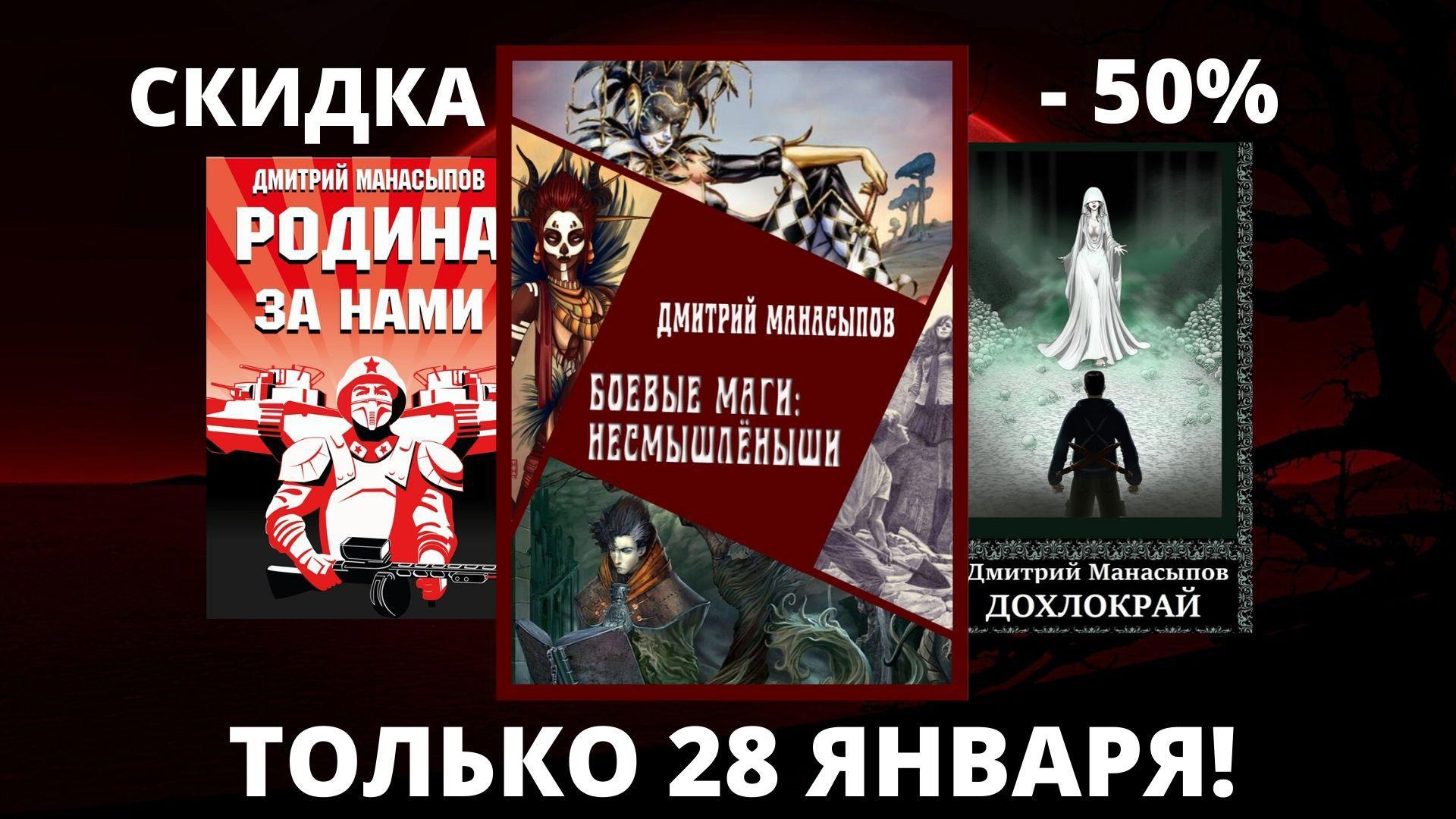 Автор: Дмитрий МанасыповАкция, уважаемые и обожаемые! Один день, 28 января, скидка в 50 процентов на три книги, размещенных на сайте АвторТудей. Не читали трех книг, участвующих в распродаже? Самое время ознакомиться и решить - как быть 28.01.2020.