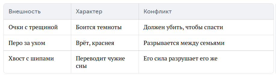 3 детали внешности + 2 контрастные черты характера × 1 мощный конфликт = персонаж, которого запомнят.