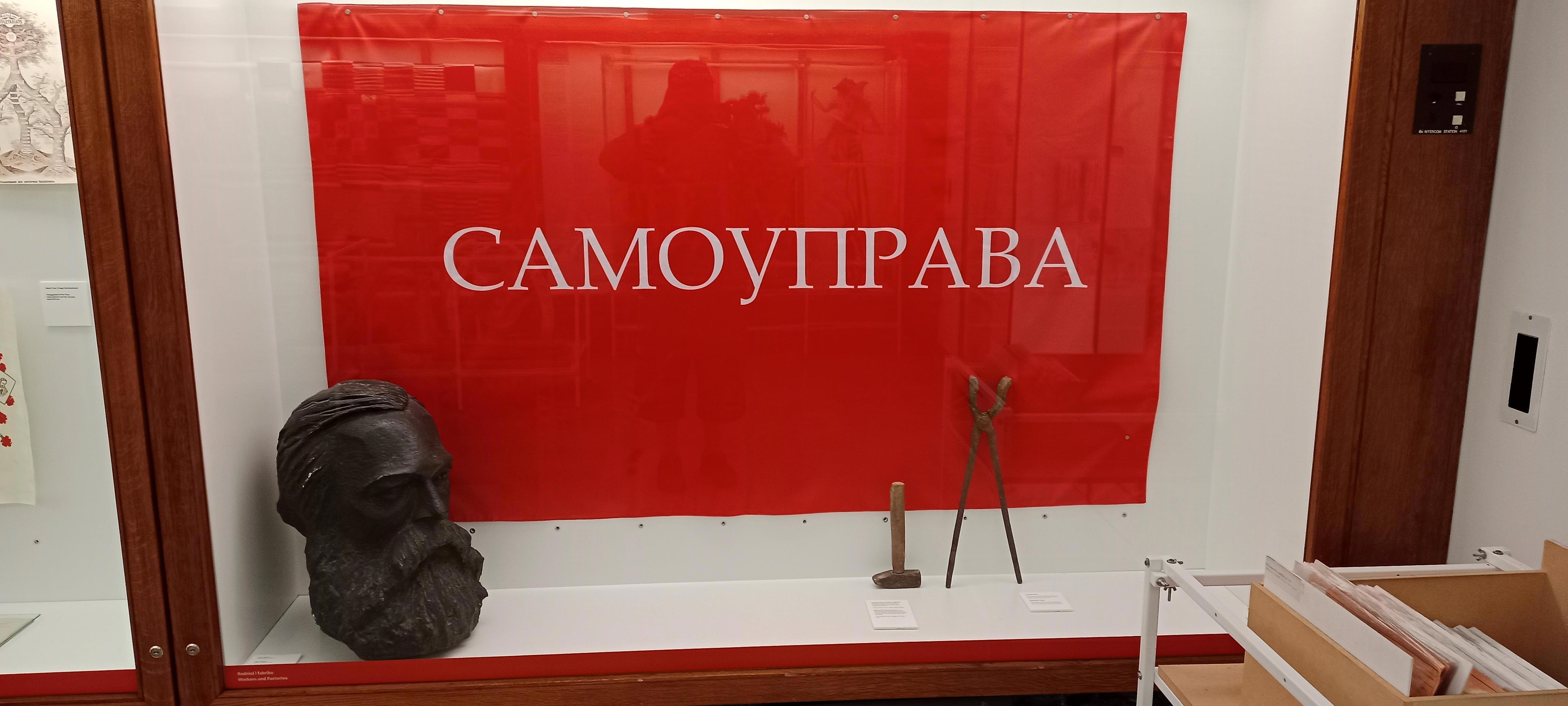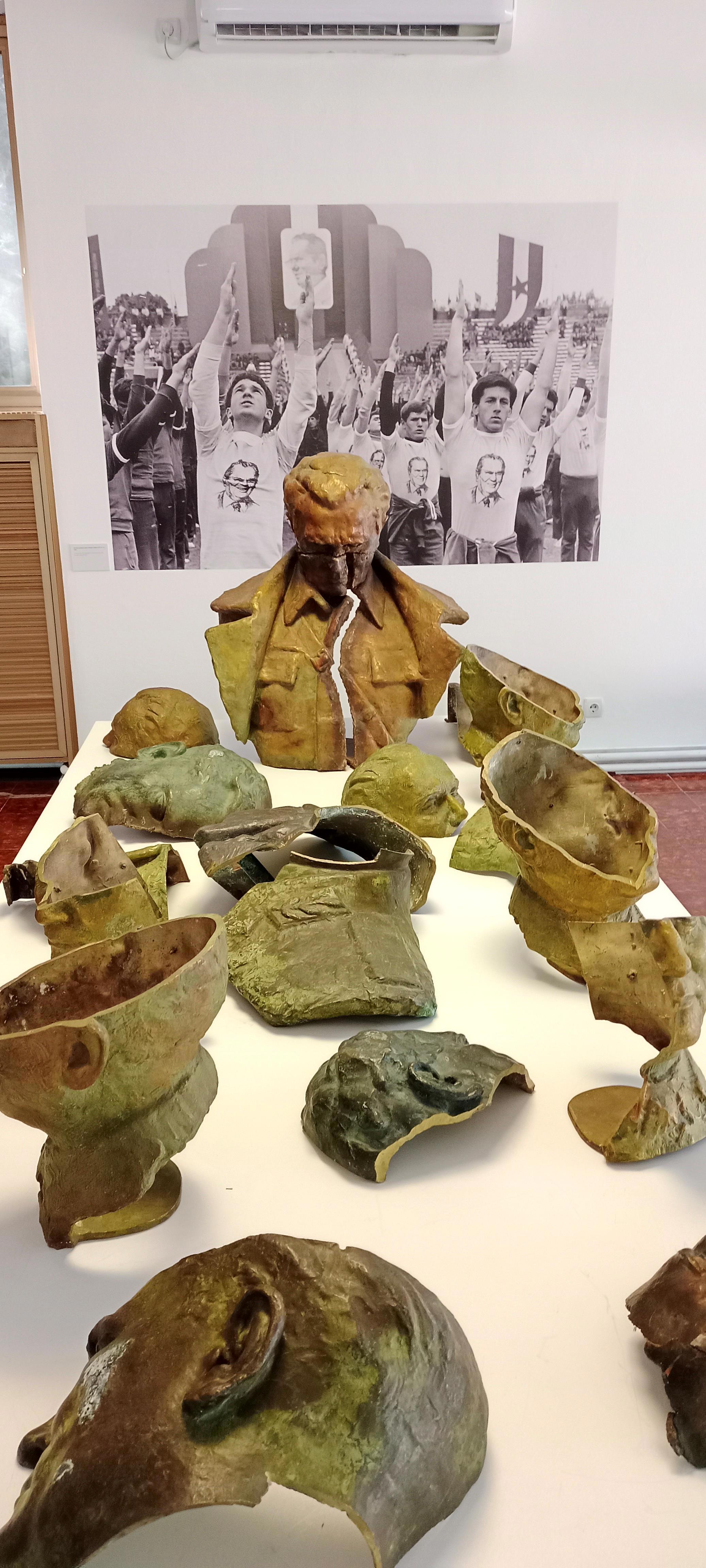 Рядом с могилой в павильоне -- небольшая экспозиция. Не обошлось без глума: выставлены головы Тито -- части снесённых ему памятников...