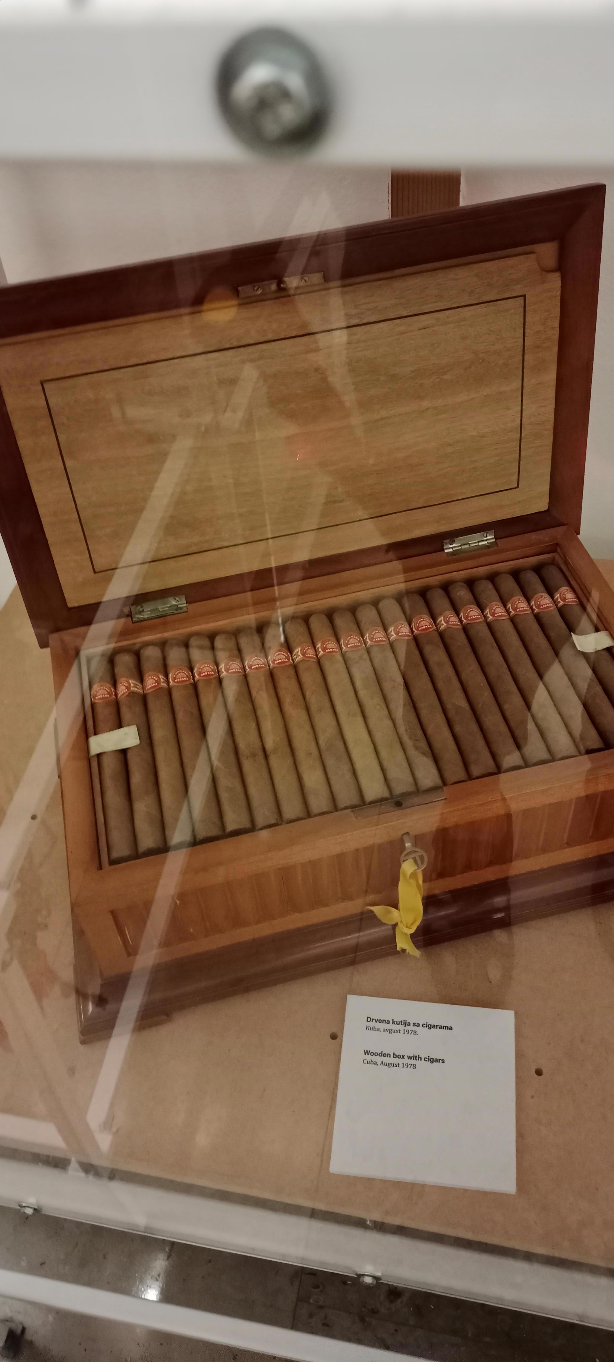 Выставлены в музее Югославии, в частности, подарки Тито от разных государственных деятелей. Вот, Фидель Кастро сигары подарил.