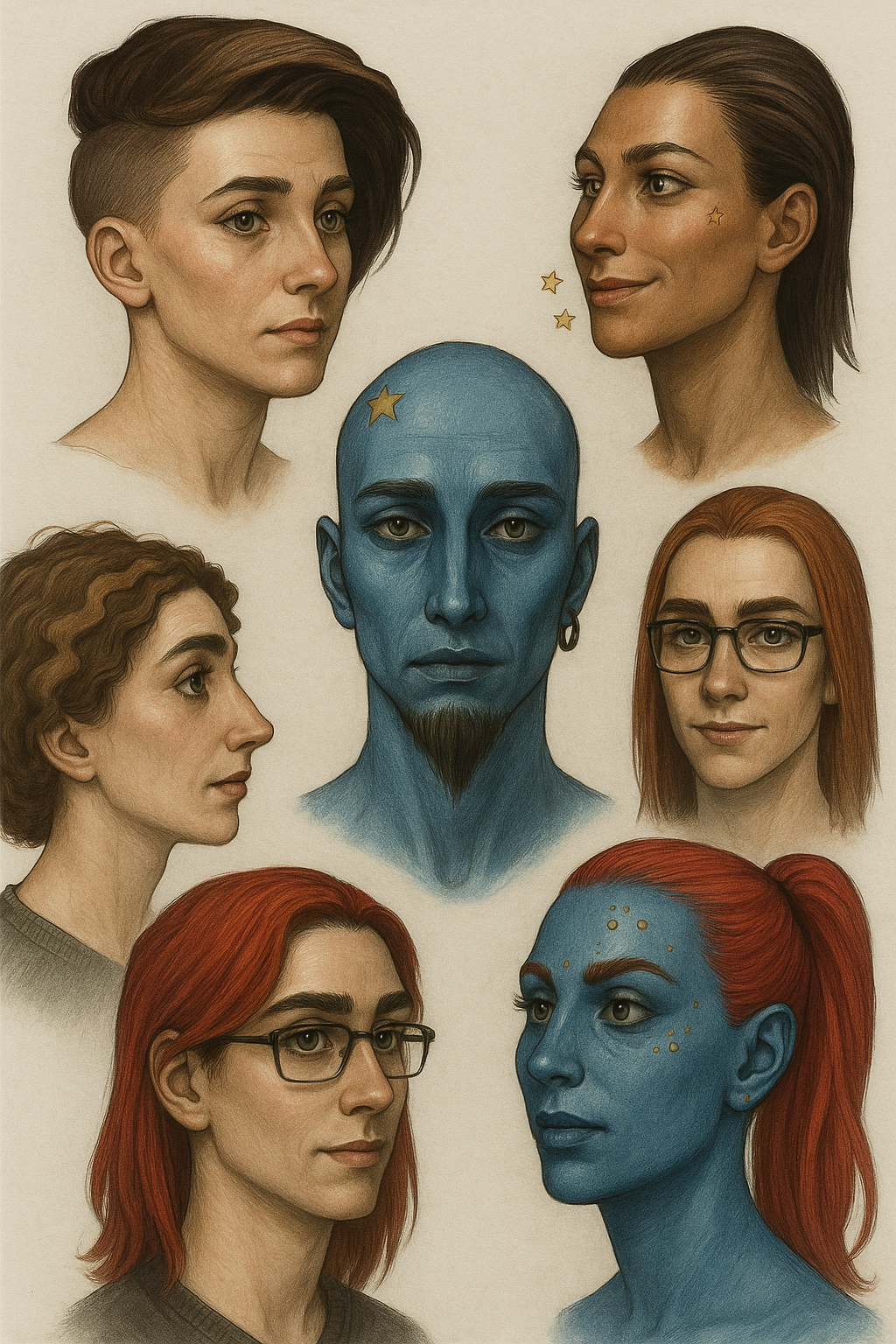Еще покажу, как по летающим головам чат дорисовал портреты. Вот мой древний набросок: