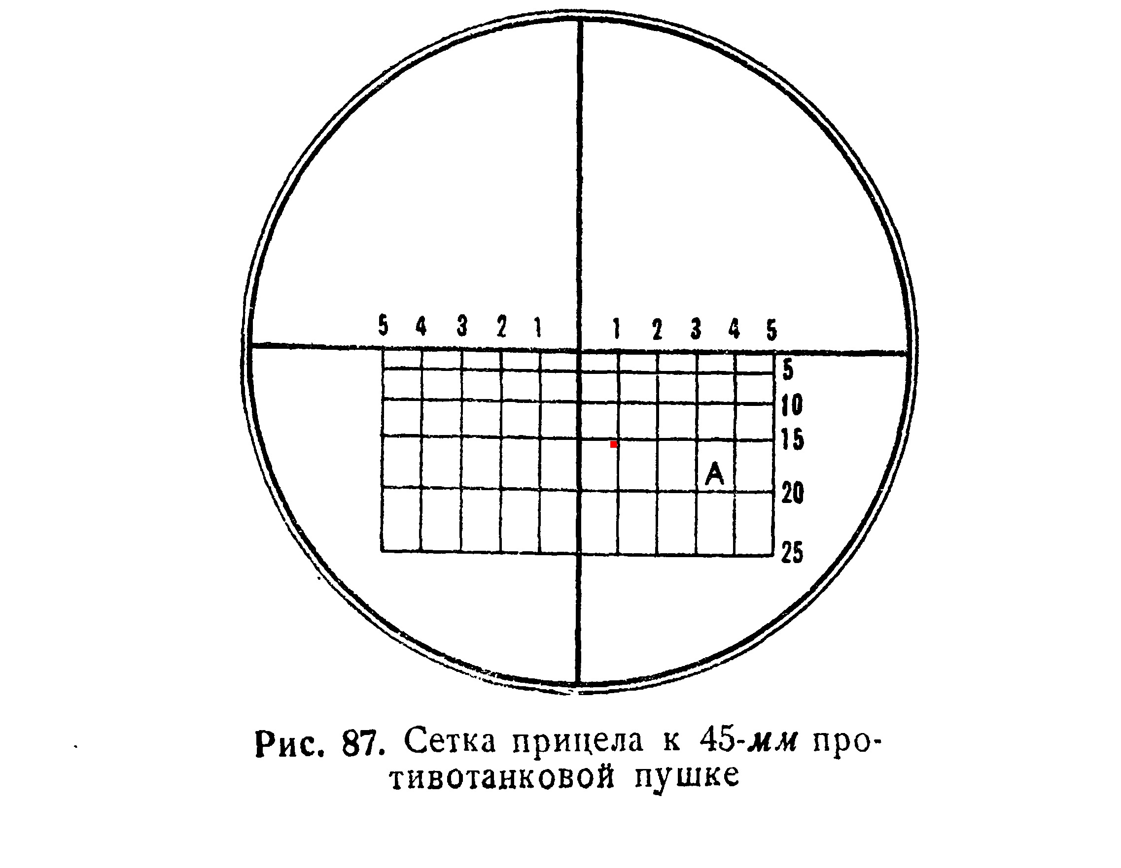 Поле зрения прицела я приводил в предыдущей части, но продублирую и тут. Для разнообразия, отметил вам “танчик” шириной 3 м на дистанции в полтора кэмэ) Видно, что для быстрой наводки тут имеются баллистические шкалы (под бронебойный) и шкала угловых поправок для стрельбы по движущейся цели с шагом в 10 тысячных.