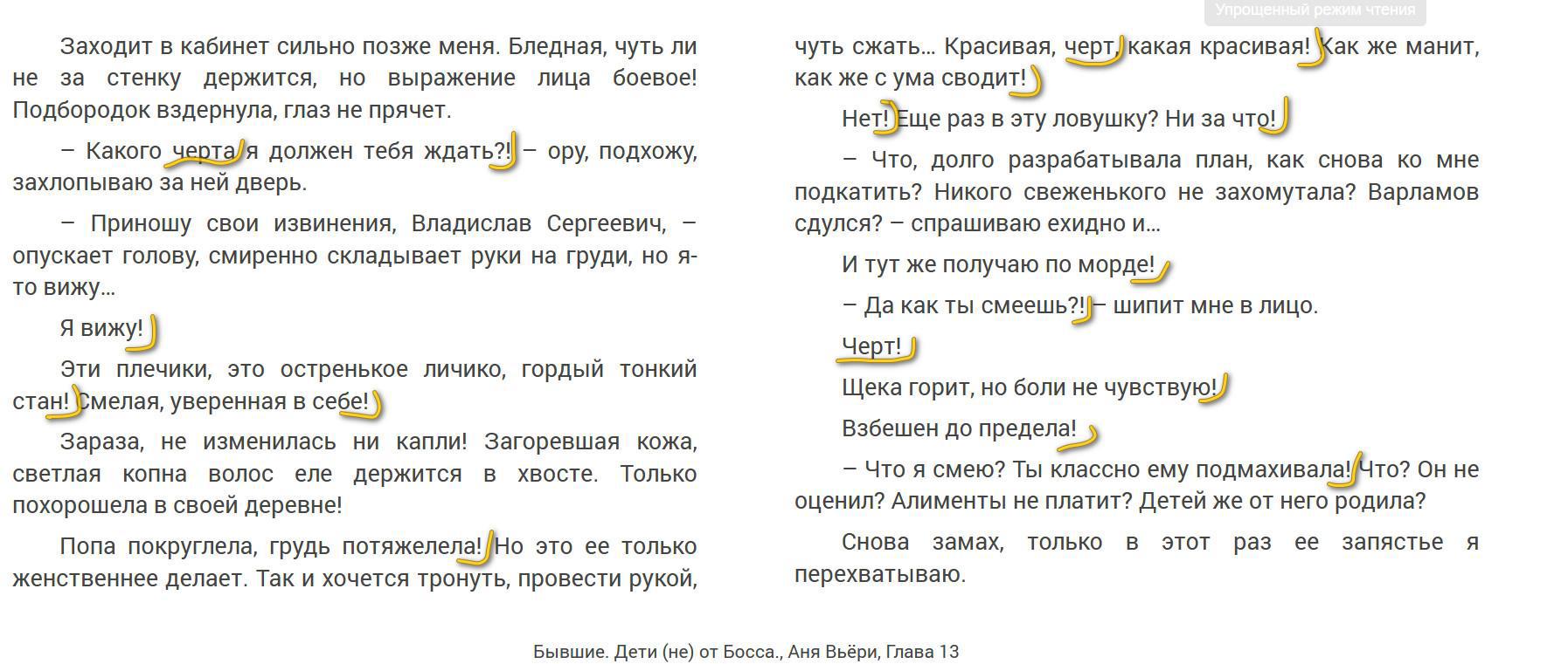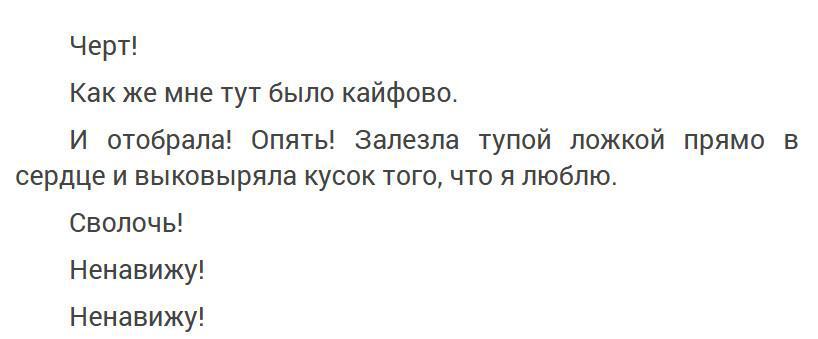 Фиги, хрены, черти и блин - норма языка у Ани. Восклицательные знаки на каждой странице по десять штук. Любит орать на читателя Аня, считая их слепоглухонемыми.