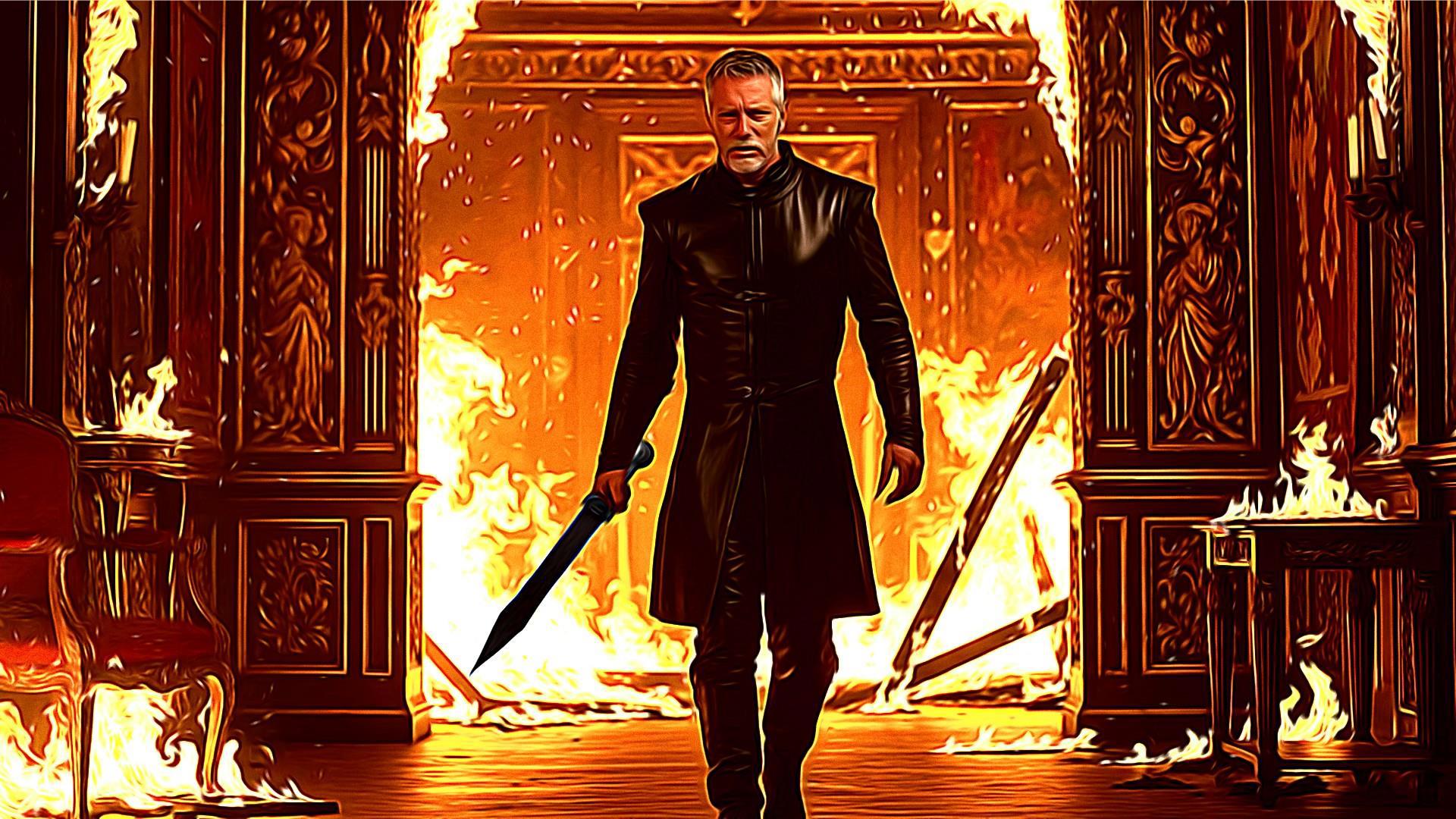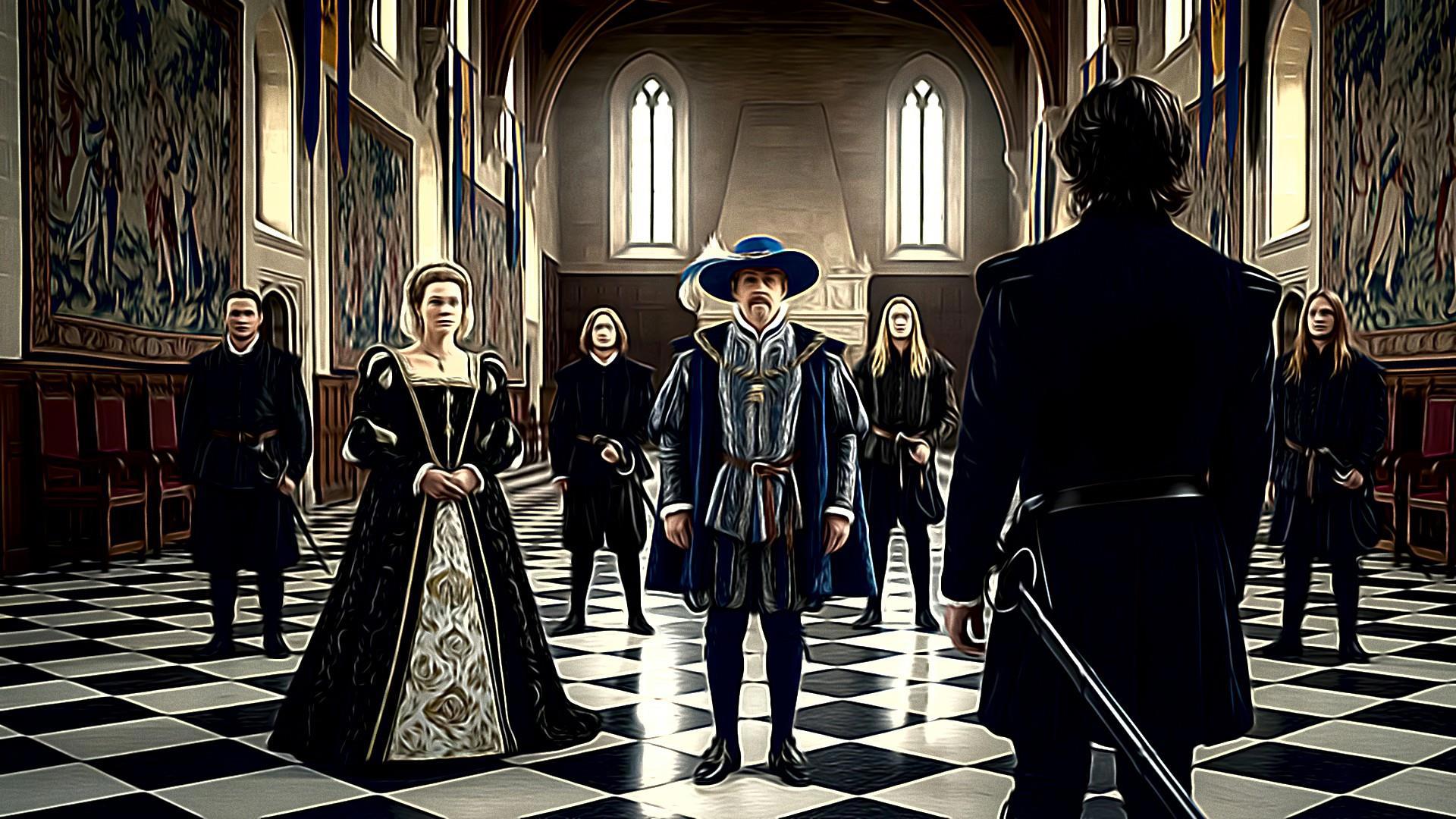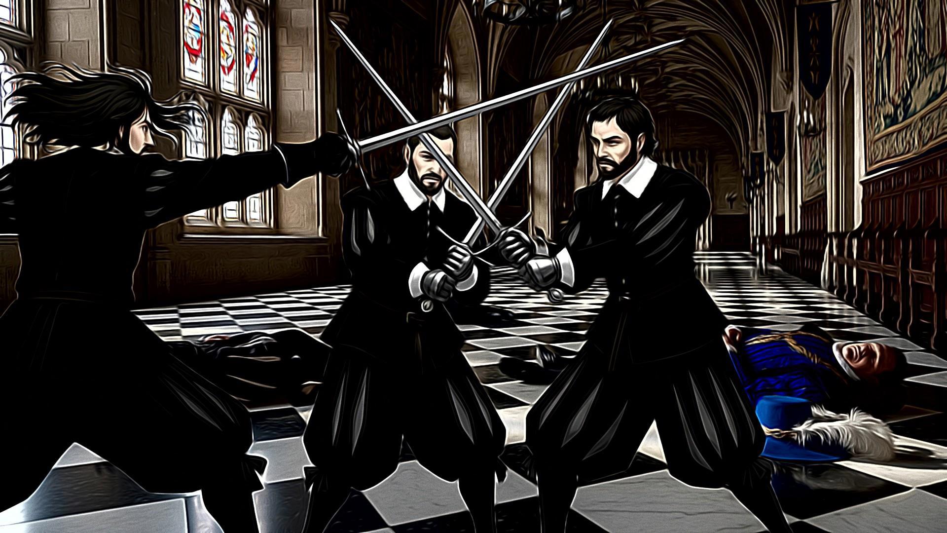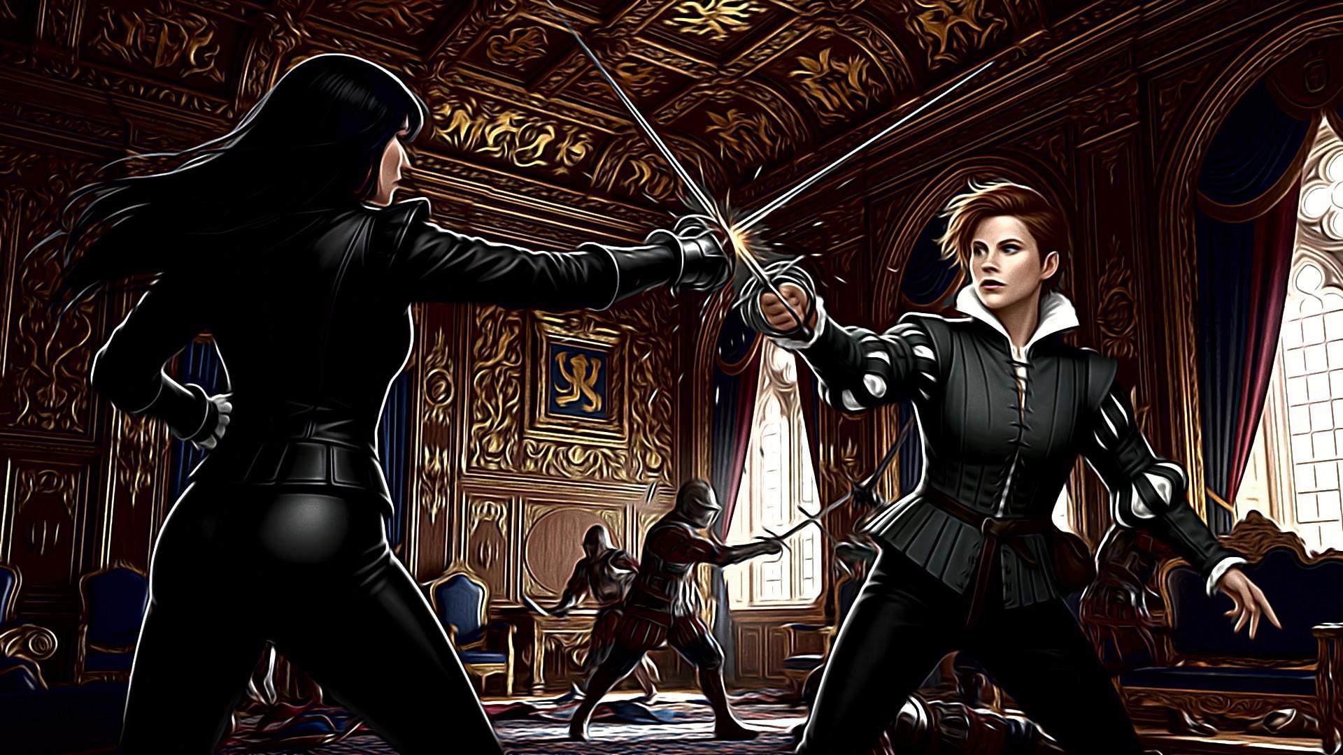 Оказалось - конечно же смерть. Королева устроила заговор, в котором Раньяну была уготована роль убийцы короля. Но всё пошло не так. Для всех. Раньян рубит людей королевы, а потом ещё кучу народу, пробиваясь через весь дворец к покоям Артиго. На заднем плане там король лежит, которого люди его жёнушки и замочили первым. Двуручников в этой драке не было, все противники Раньяна были вооружены мечами с корзинчатыми гардами. Генерить сцены с фехтованием вообще очень сложно, а если народу много - ещё сложнее. Потому, что имеем - то имеем.
