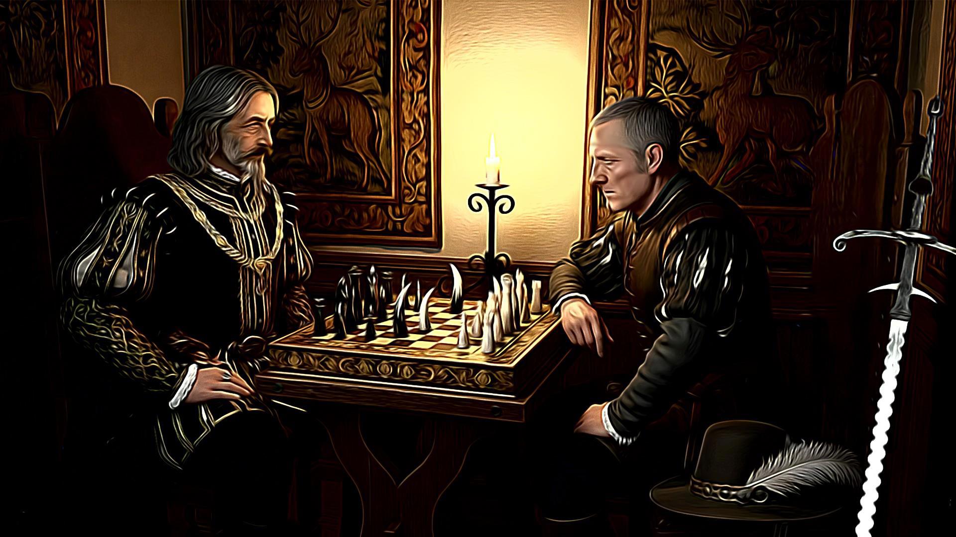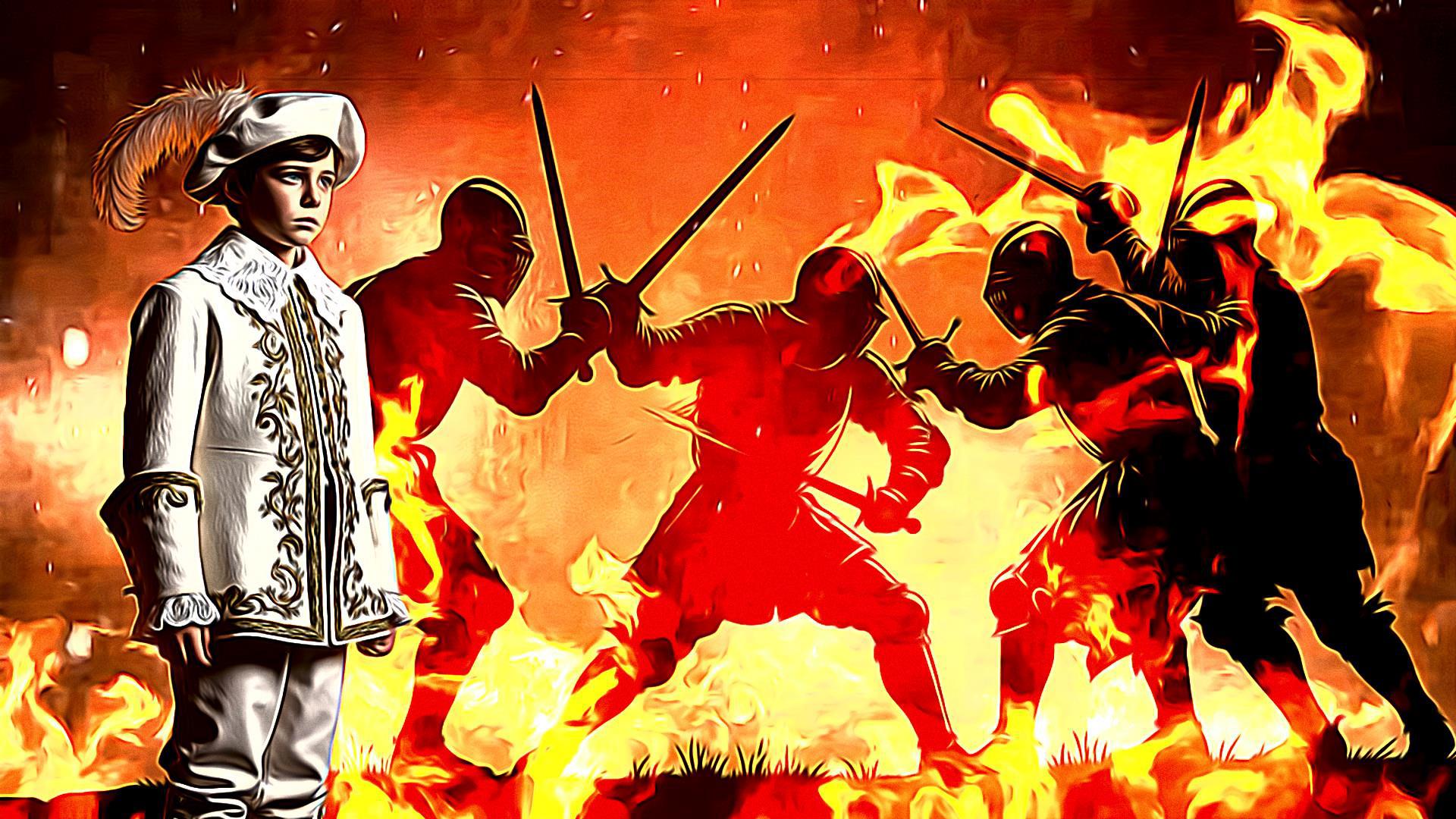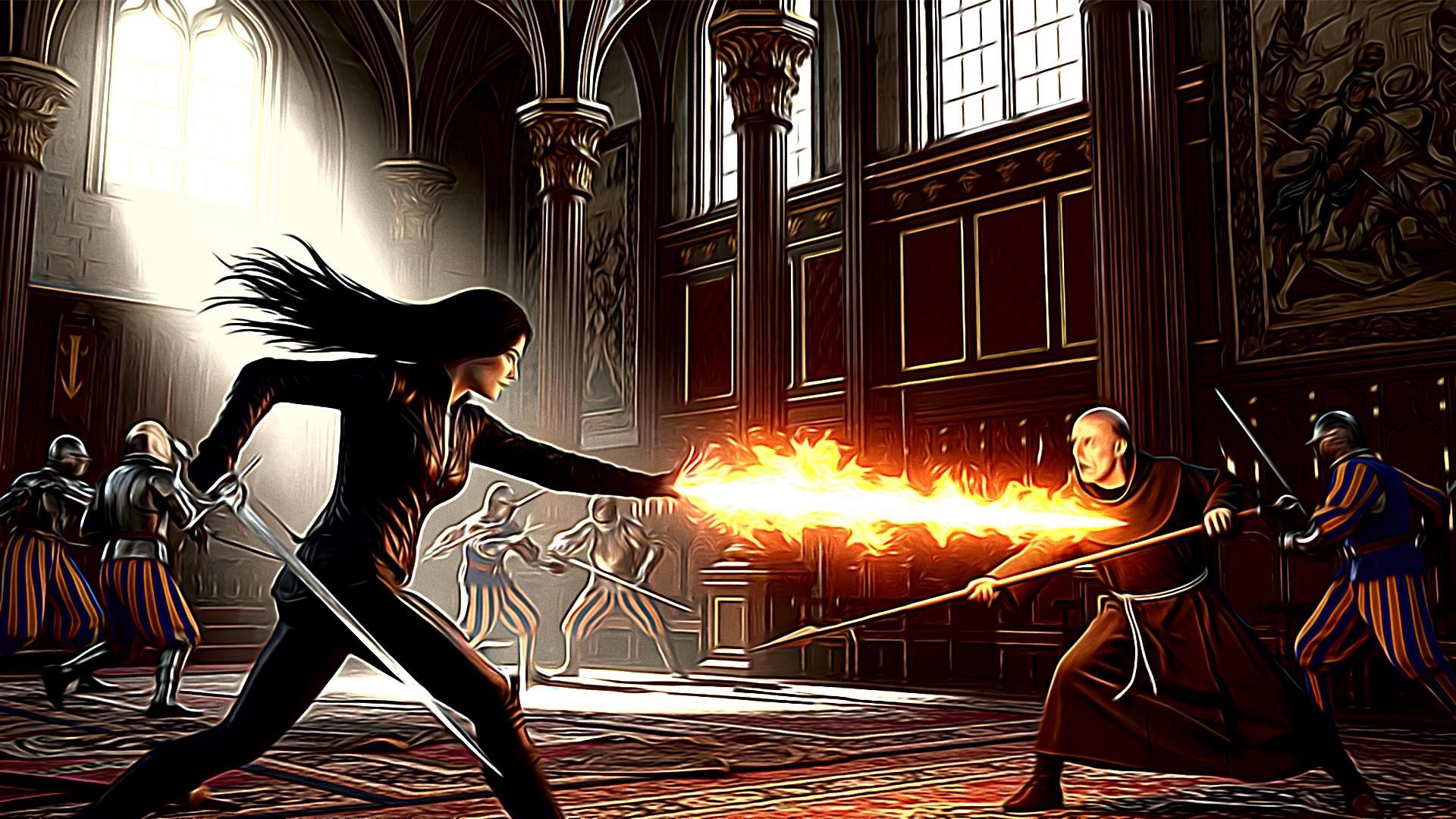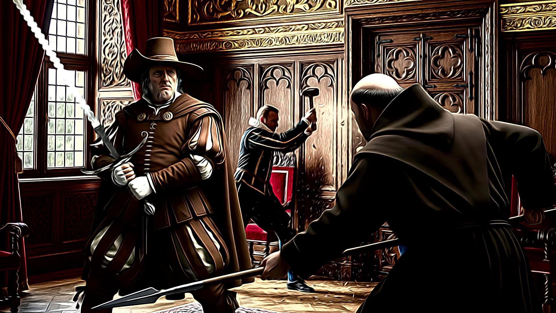 Оказалось - конечно же смерть. Королева устроила заговор, в котором Раньяну была уготована роль убийцы короля. Но всё пошло не так. Для всех. Раньян рубит людей королевы, а потом ещё кучу народу, пробиваясь через весь дворец к покоям Артиго. На заднем плане там король лежит, которого люди его жёнушки и замочили первым. Двуручников в этой драке не было, все противники Раньяна были вооружены мечами с корзинчатыми гардами. Генерить сцены с фехтованием вообще очень сложно, а если народу много - ещё сложнее. Потому, что имеем - то имеем.
