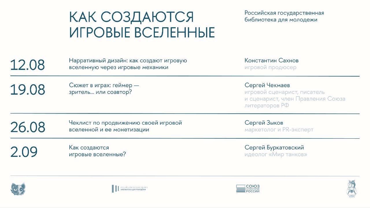 Мы с друзьями решили провести в августе серию из четырех очных встреч, объединенных темой создания игровых вселенных. На стыке игровой индустрии и литературы.