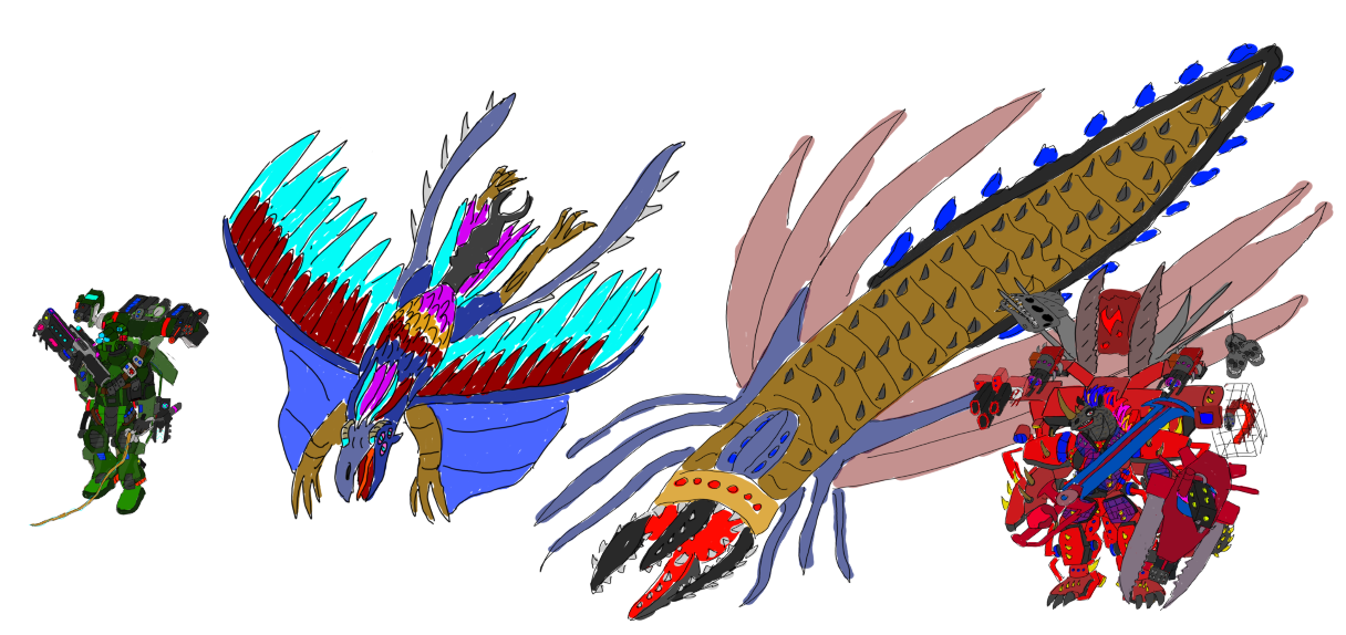 Куотльрух и Буллорм показатель высшего мастерства приручения. Пернатый хищник и нечто похожее на гигантского червя слушаются своих хозяевам беспрекословно. Что сказать, технология нейро-гормональных медиаторов проста, груба, но в то же время эффективна. Как и многие другие устройства кор-рамов.