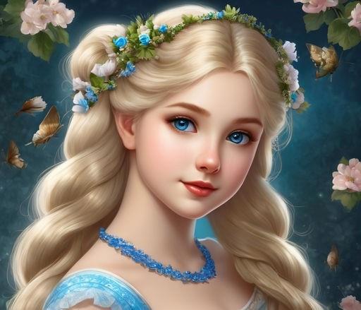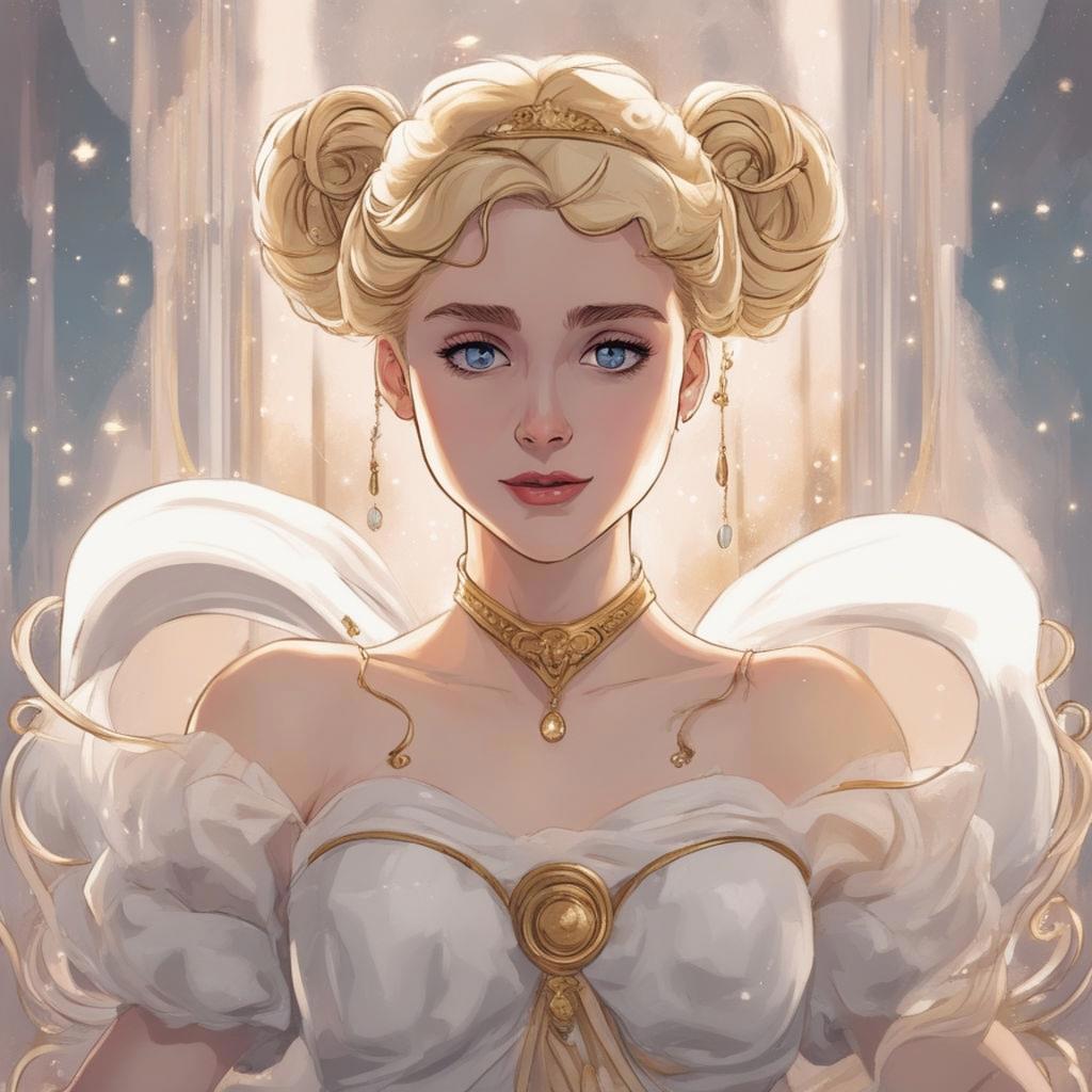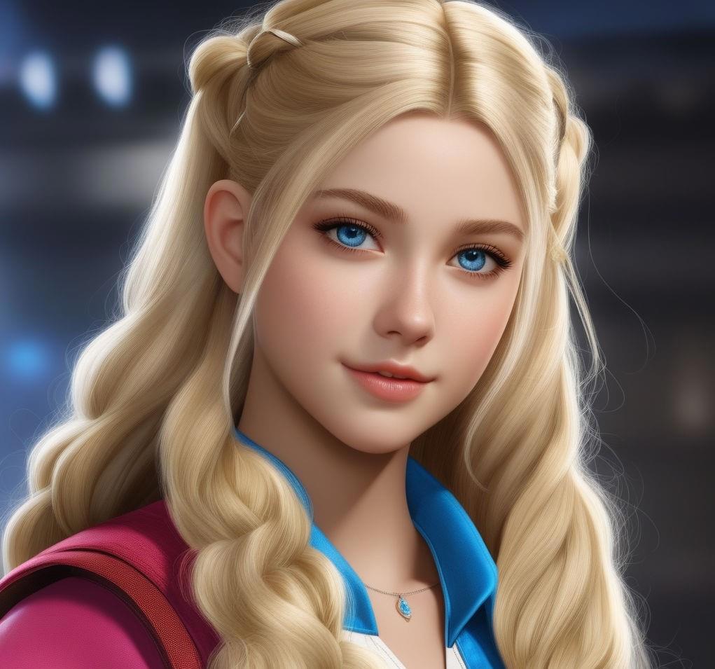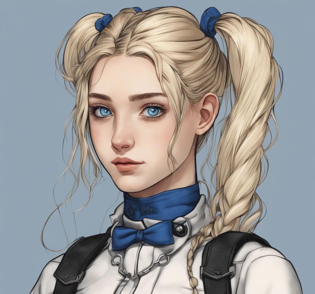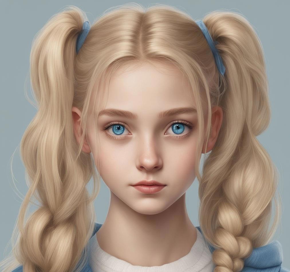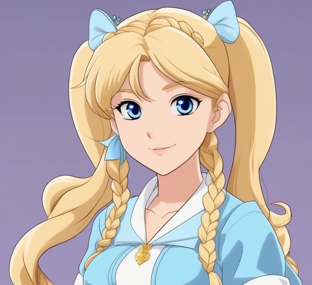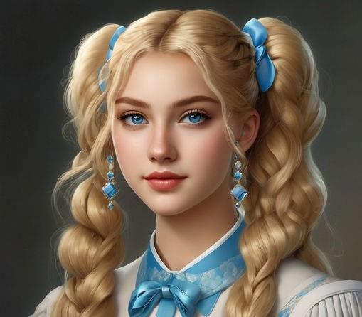 Шестнадцатилетняя девушка с голубыми глазами и длинными светлыми волосами, которые она носит в виде двух хвостиков по бокам с пучками наверху