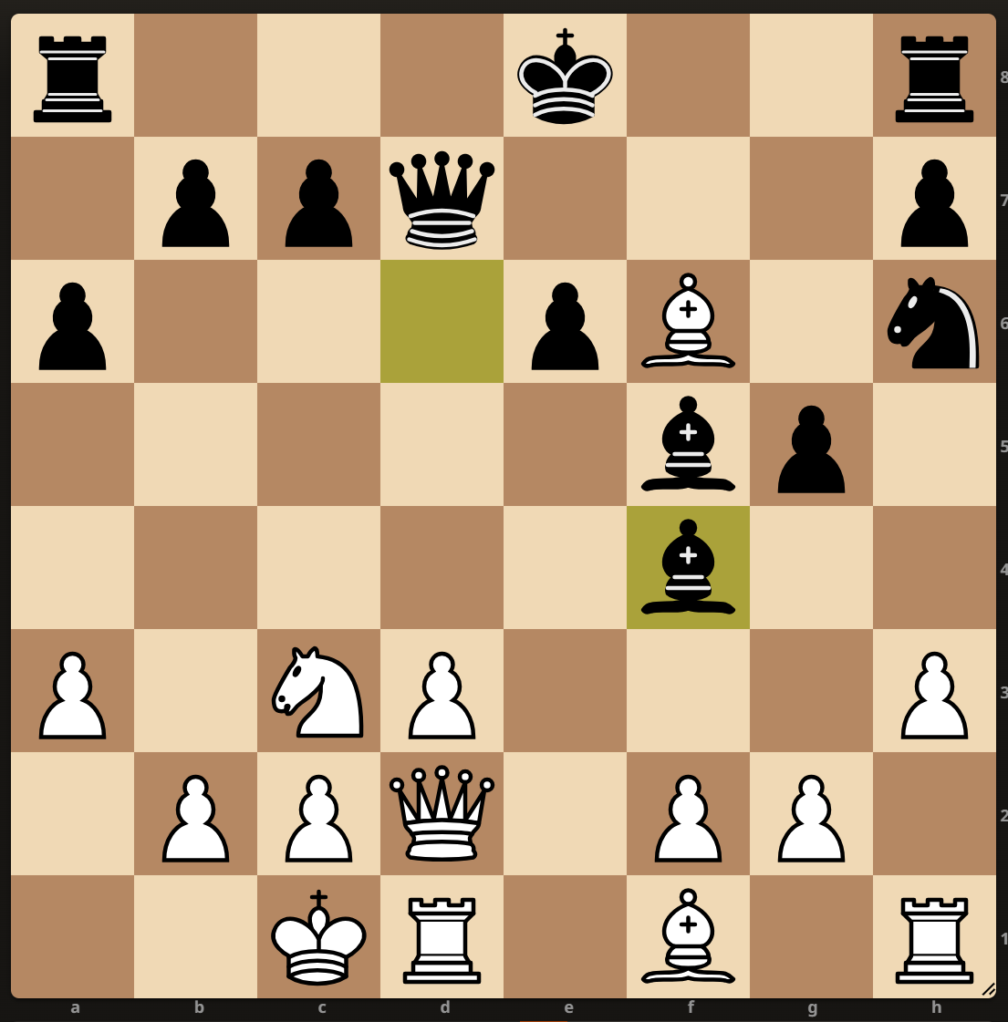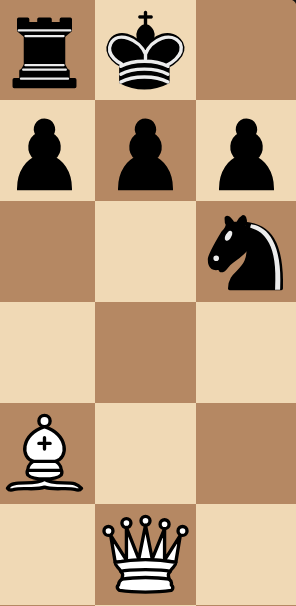 Вот тут, например, белый ферзь связан. Он не может отойти на безопасное поле, потому что тогда король окажется под шахом. Итак, белый ферзь смотрит в глаза своей смерти. Спастись невозможно. Он, конечно, заберёт с собой слона, но это слабое утешение.