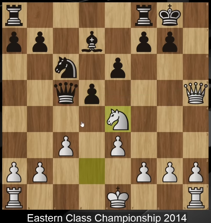 Видите, белый конь прыгнул на e4, угрожая ферзю. Чёрная пешка d5 имеет все возможности его убить... Но тогда белый ферзь убьёт чёрного. Пешке приходится бездействовать, чёрный ферзь уходит из-под удара... Но всё зря. С поля e4 конь готовится прыгнуть на g5 и теперь на пару с ферзём будет матовать чёрного короля.