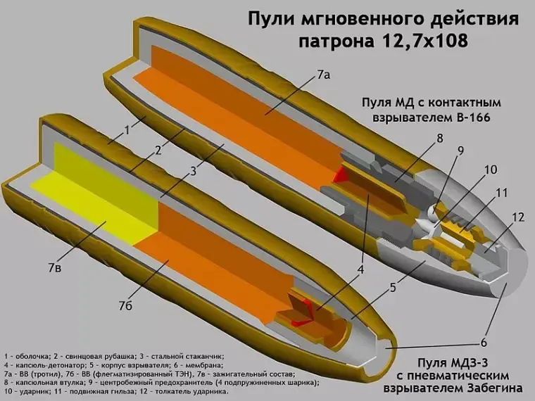 позднее в виде биметаллической трубки с латунной вставкой с донной части и латунной прокладки), стальной головки, мембраны, снаряжения и капсюля- воспламенителя, который вместе с мембраной является взрывателем. Верхние шашки снаряжения пули представляли собой зажигательный состав, а нижние - взрывчатое вещество (флегматезированный ТЭН). Поражение цели достигалось за счёт фугасного и осколочного действия. Пуля МДЗ-3 зажигала бензин в бензобаках незащищённых бронёй. При попадании в дюралюминиевую обшивку самолёта пуля образовывала на входе отверстие диаметром около 20 мм и на выходе отверстие диаметром до 110 мм. Выпуск патронов с пулей МДЗ-3 продолжался как минимум до 1951 года.