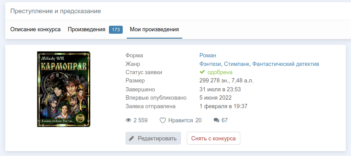 Не без приключений, но в срок приёма романов на конкурс "Преступление и предсказание" я уложилась, получив заветный значок участника.
