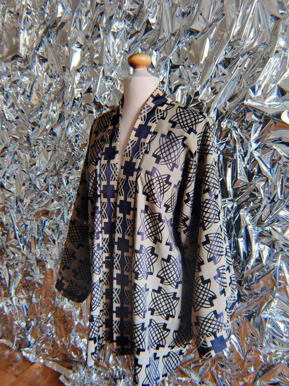 Это хаори вынашивалось мной около года. Я купила ткань специально для него — принт напоминал традиционные японские мотивы, и я была в восторге! Но ткань ждала своего звёздного часа: то времени не хватало, то хотелось поиграть с формой, то вдруг захотелось воротник с загибом. В итоге я выбрала простой современный вариант — так сильно хотелось уже его носить, что в один из выходных забила на всё и пустилась в пошив.
