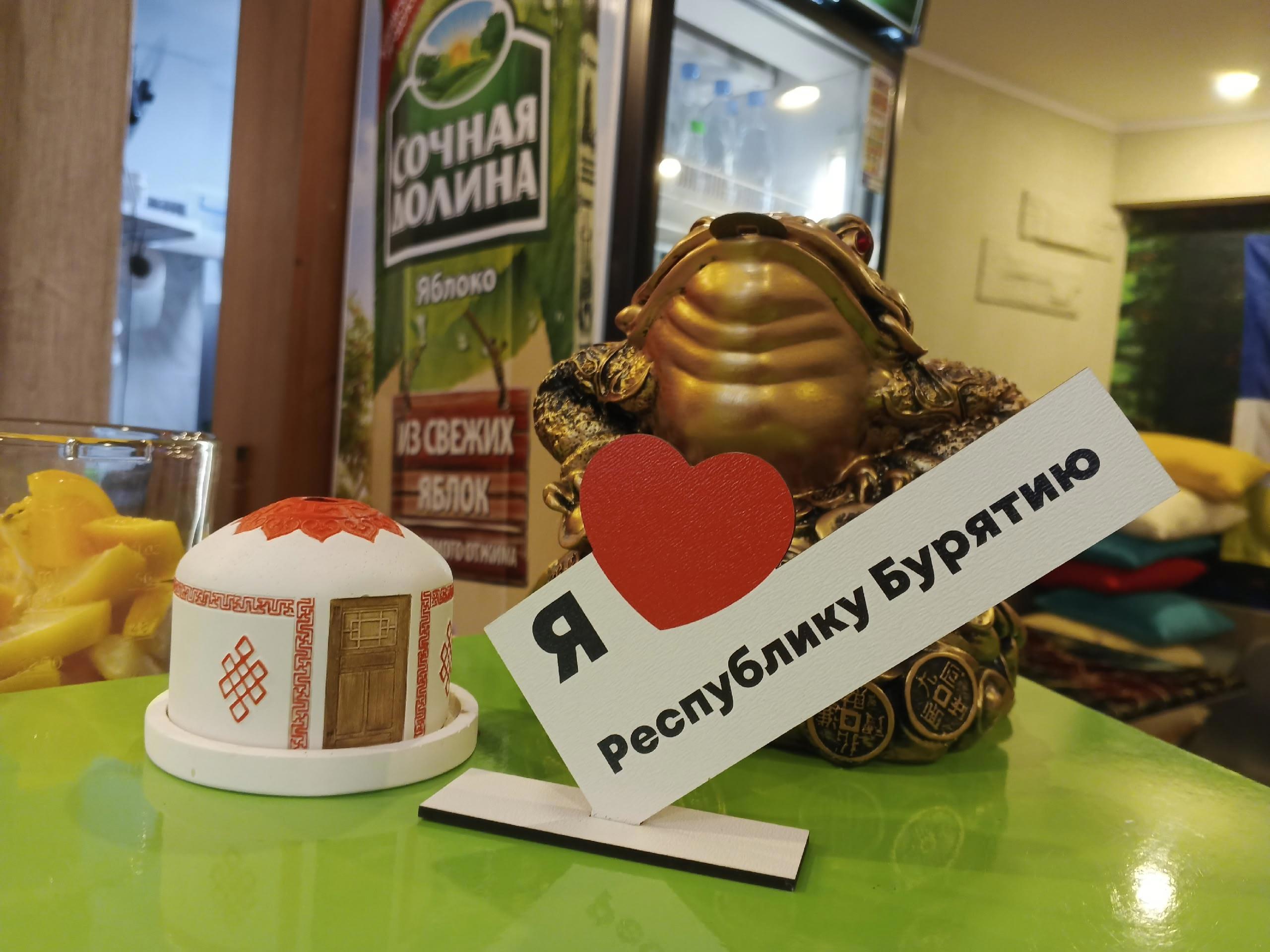 В кафе чисто, аккуратно. На стоечке нас встретил маленький сувенир, призывающий любить Бурятию. А мы и не против, особенно с буузами в тарелке.