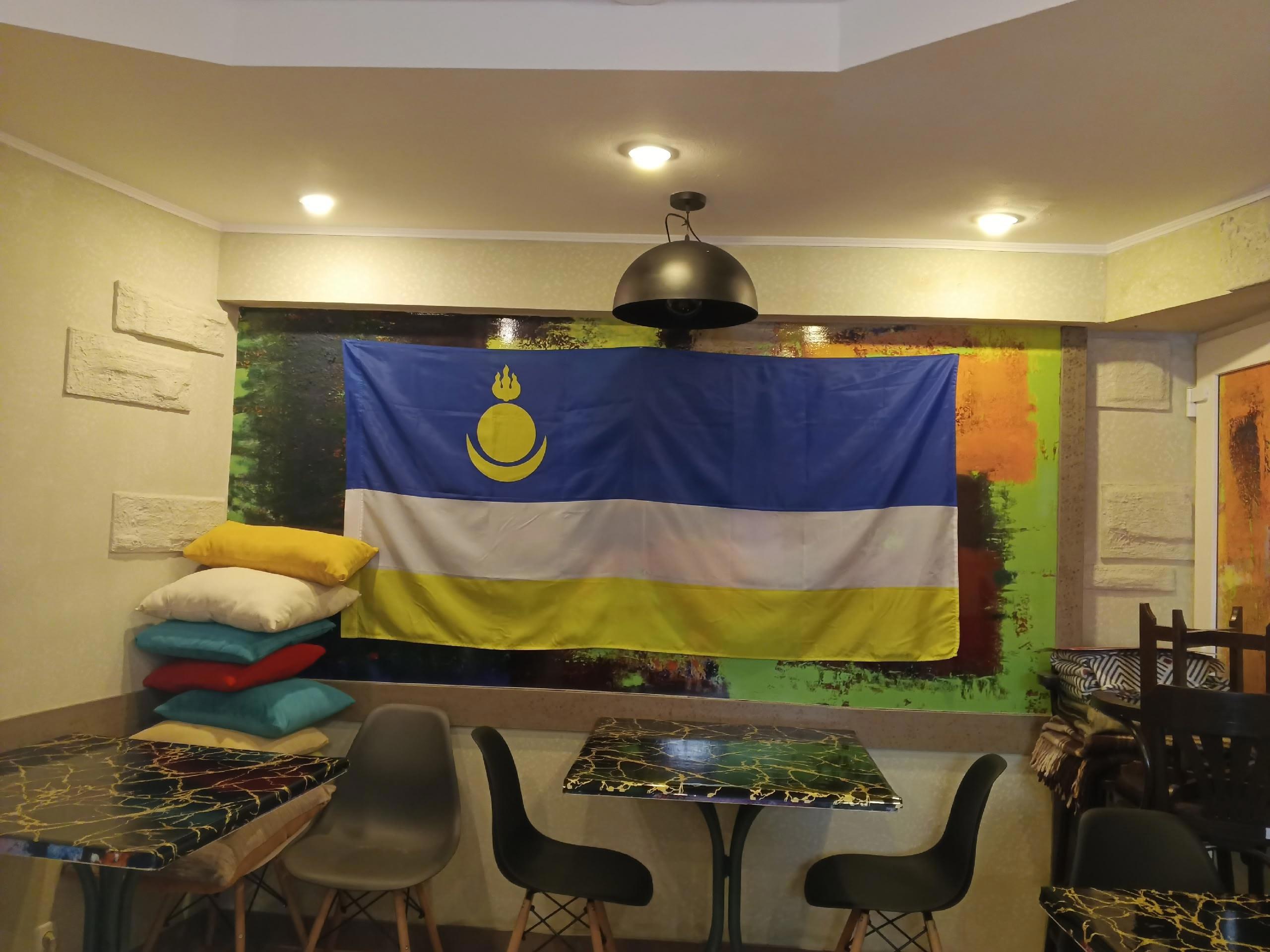 Здесь зе на стене флаг республики и подушки, их можно брать, чтобы положить на стулья...