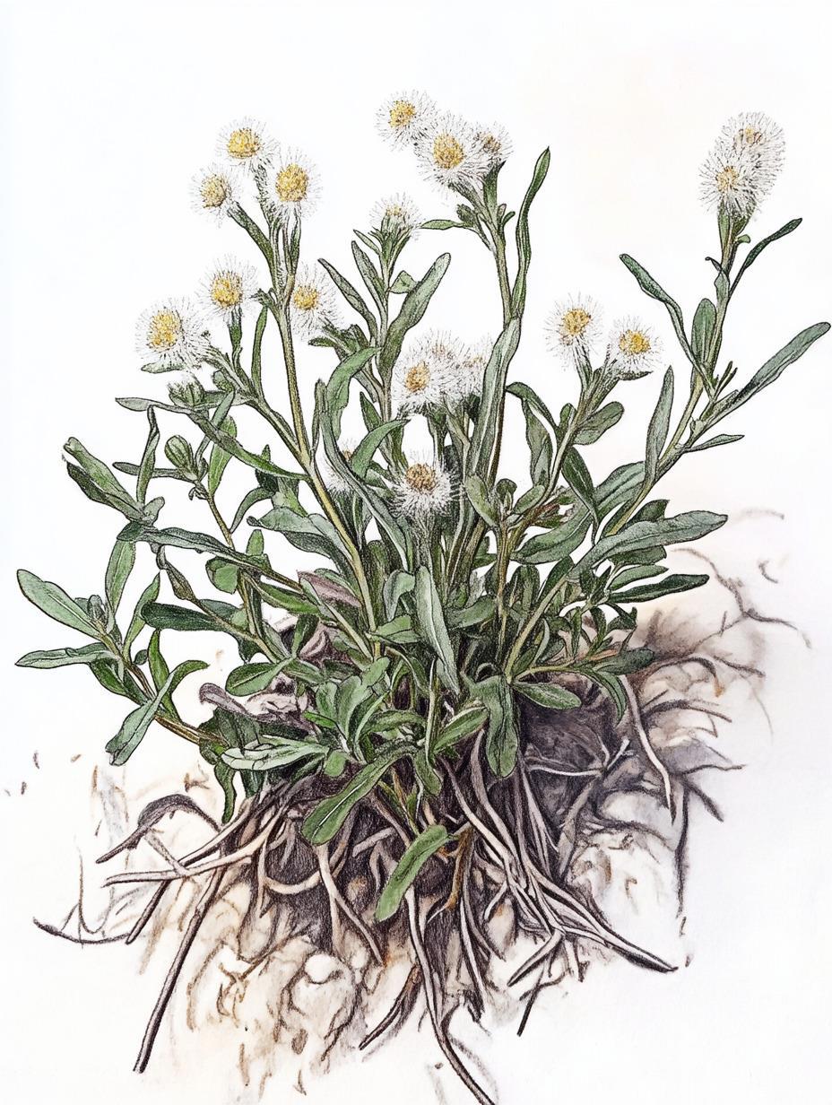 Итак, сушеница болотная (Gnaphalium uliginosum L.) или жабья трава — почти всегда обитает в низинах, на берегах рек, канав или сырых лугах — это выражаясь литературным языком. На самом деле она растет практически на любой болотине, так что речки или сырые луга можно не искать. Достаточно лужи в ближайшем пролеске. Растение это однолетние. В высоту может вырасти до 25 см. Стебель от основания очень ветвистый и узкие линейные листья. Все оно покрыто пушком и кажется серо-войлочным. Цветет все лето, маленькие желтоватые цветки горошинками прячутся среди пучков листьев.