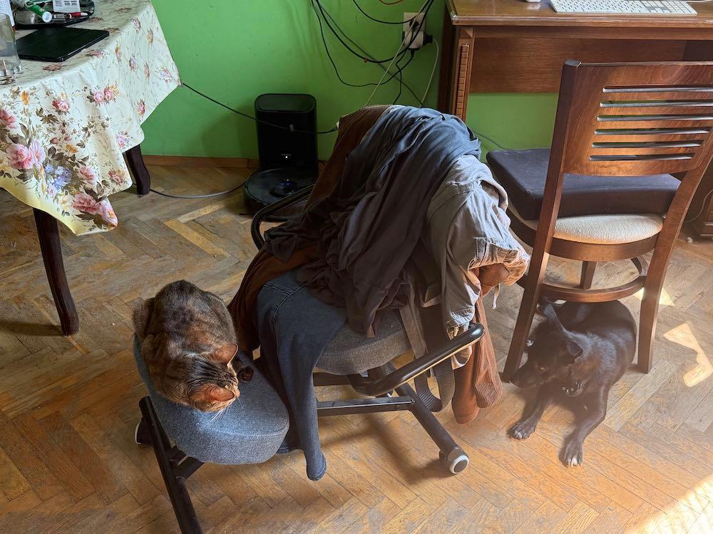 Сегодня Бася зашла на балкон, а Жужа встала в дверях, не выпуская кошку обратно в комнату. Они постояли так, понюхались — а потом Бася рывком проскочила в комнату прямо у Жужи между ногами. Та осталась в недоумении.