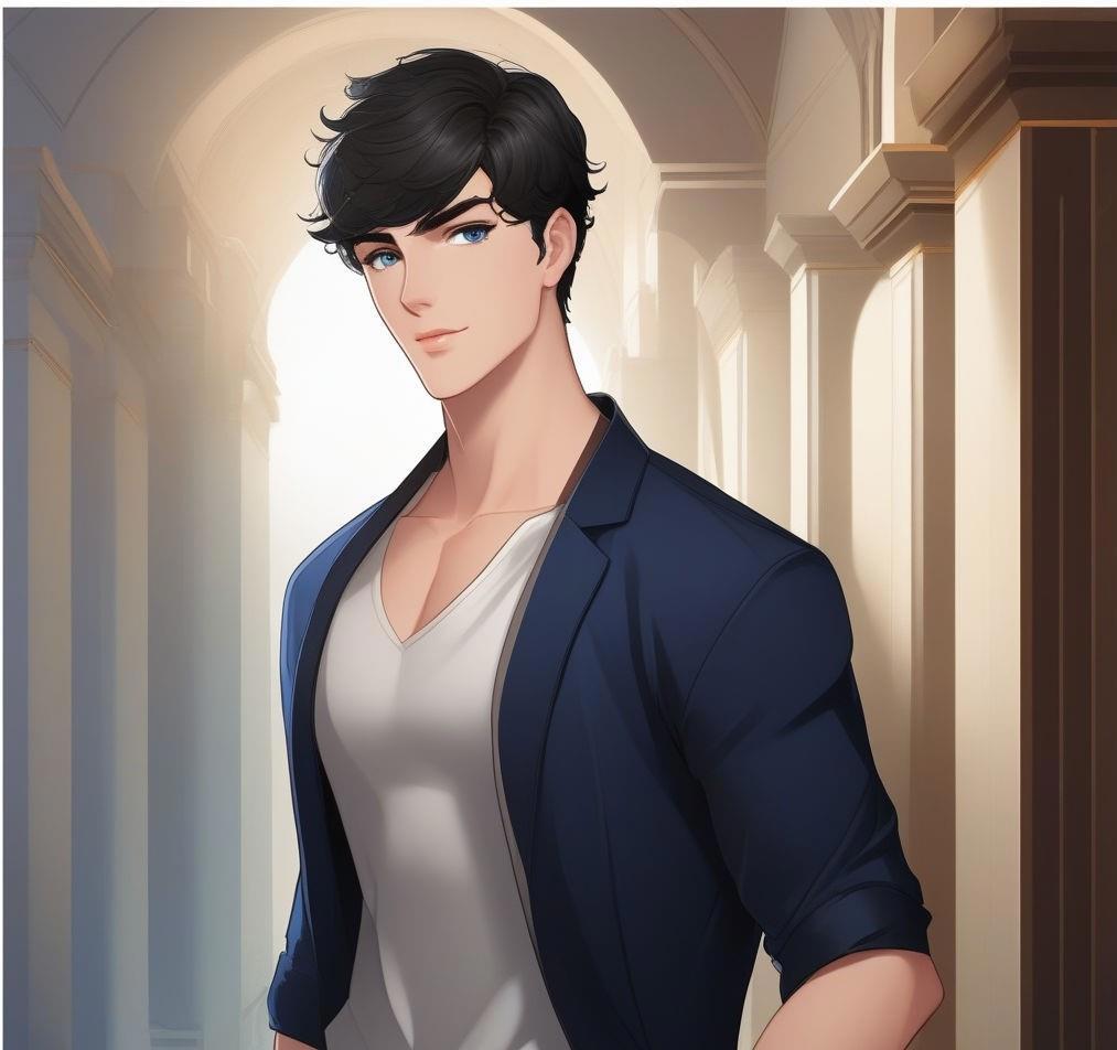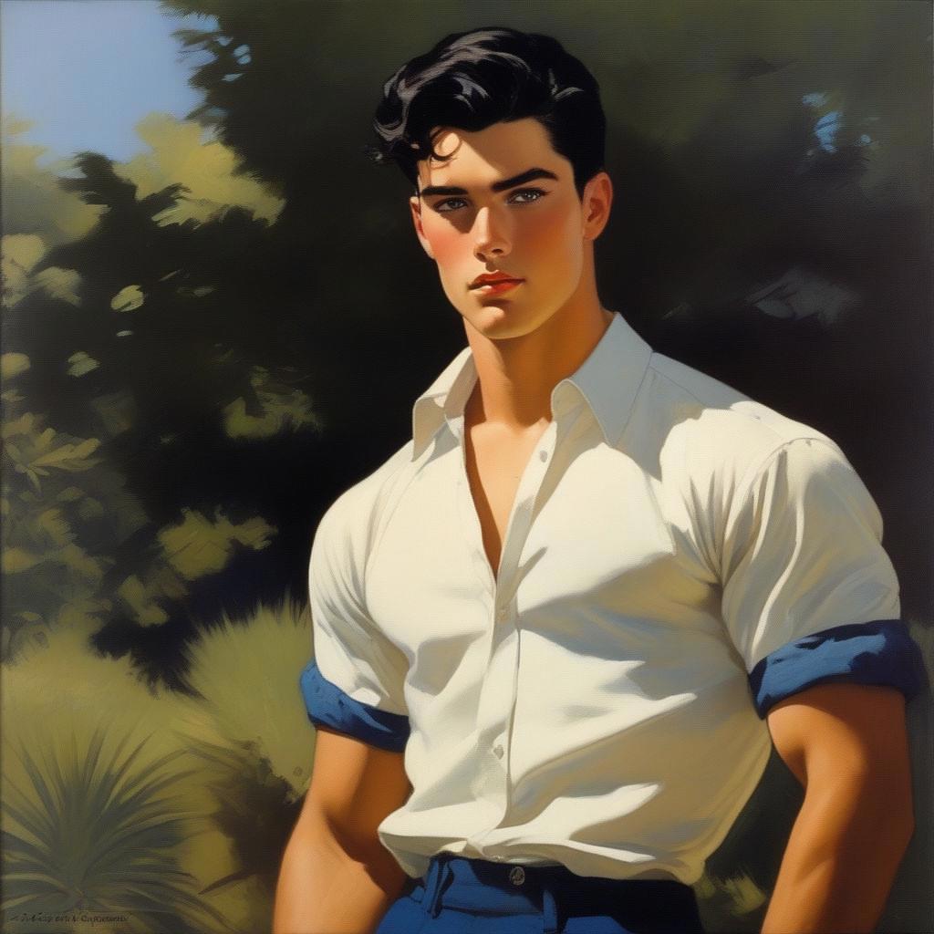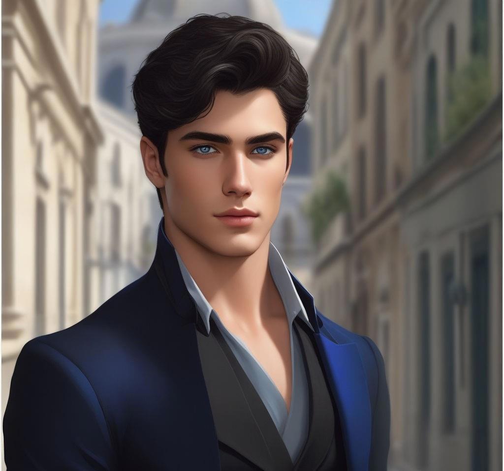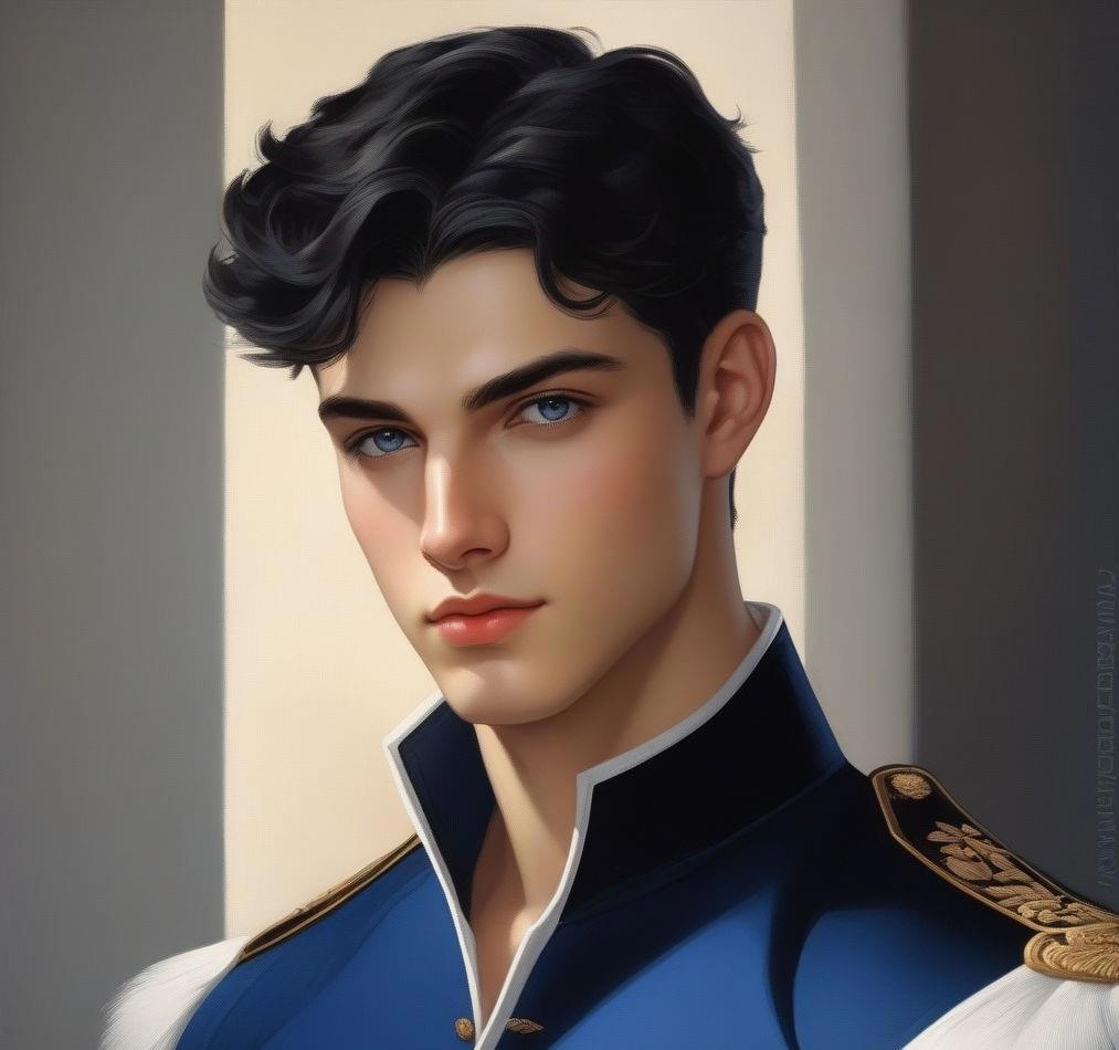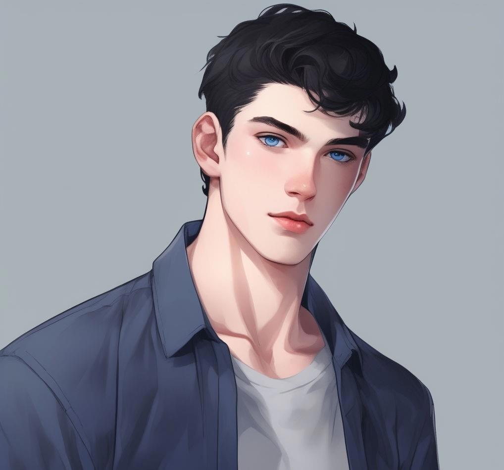 Двадцатилетний высокий широкоплечий молодой человек с короткими черными волосами с темно-синими глазами, в хорошей физической форме