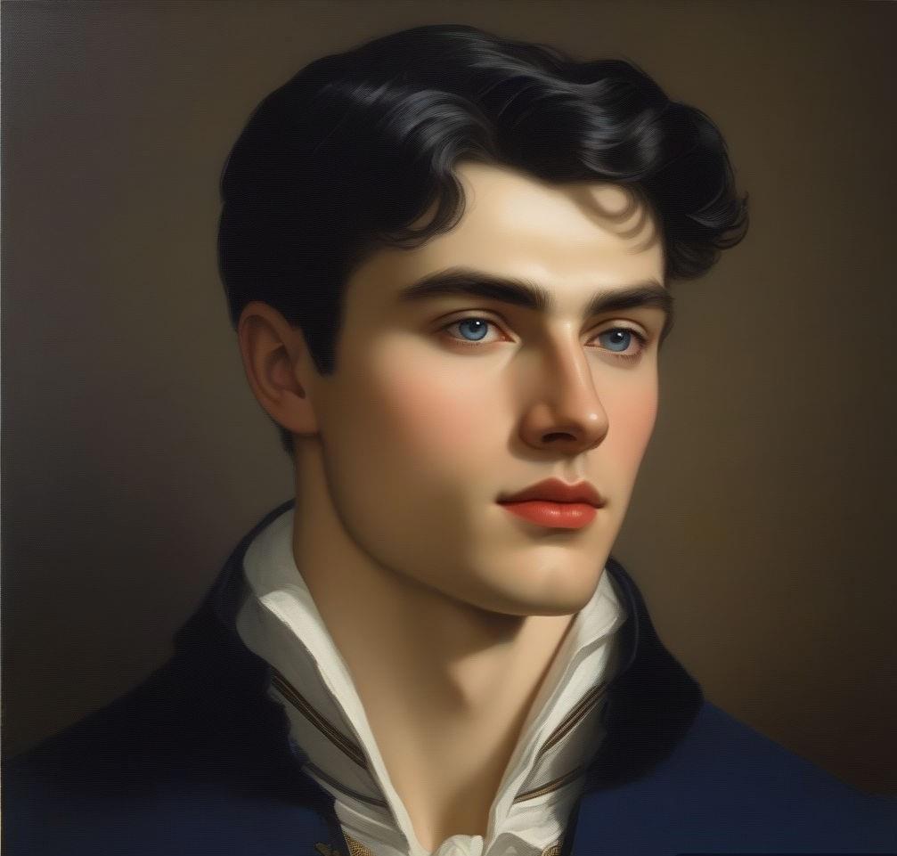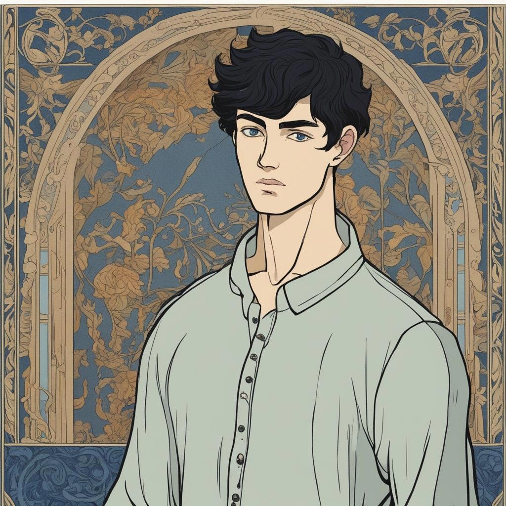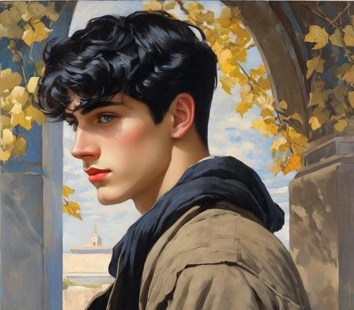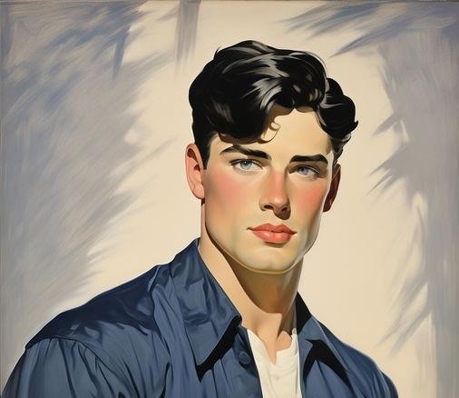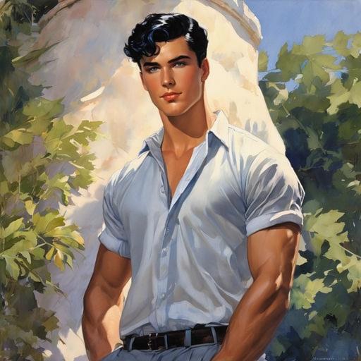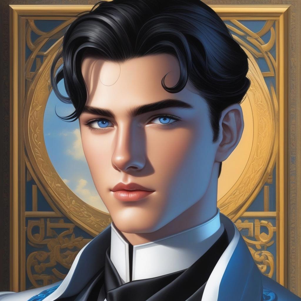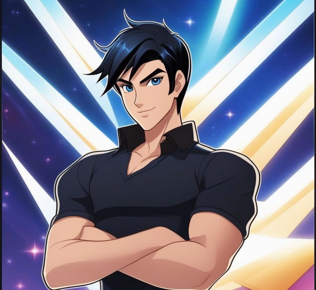 Двадцатилетний высокий широкоплечий молодой человек с короткими черными волосами с темно-синими глазами, в хорошей физической форме