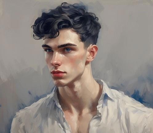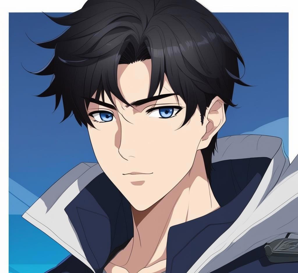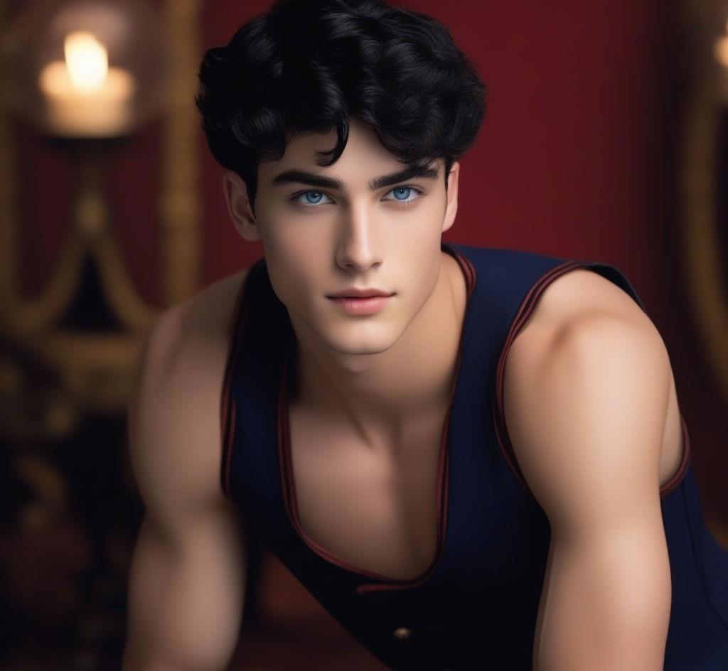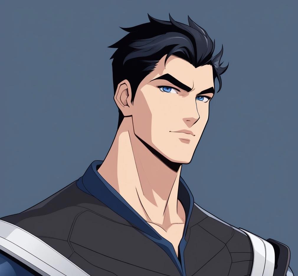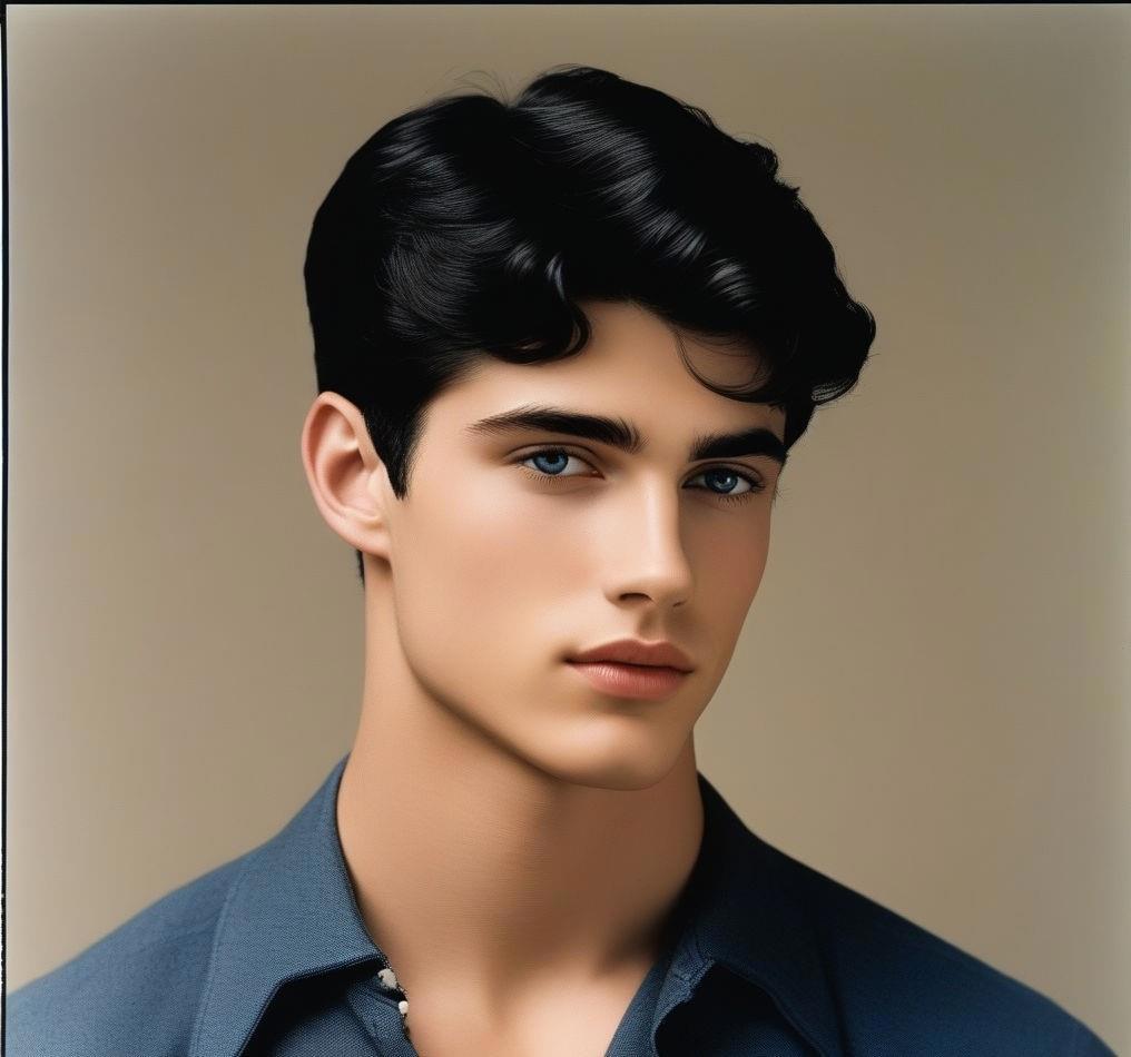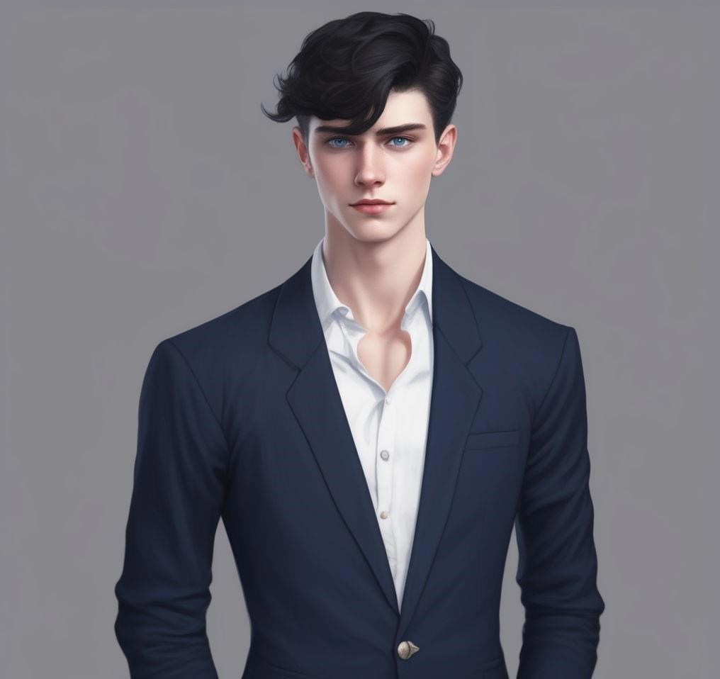 Двадцатилетний высокий широкоплечий молодой человек с короткими черными волосами с темно-синими глазами, в хорошей физической форме